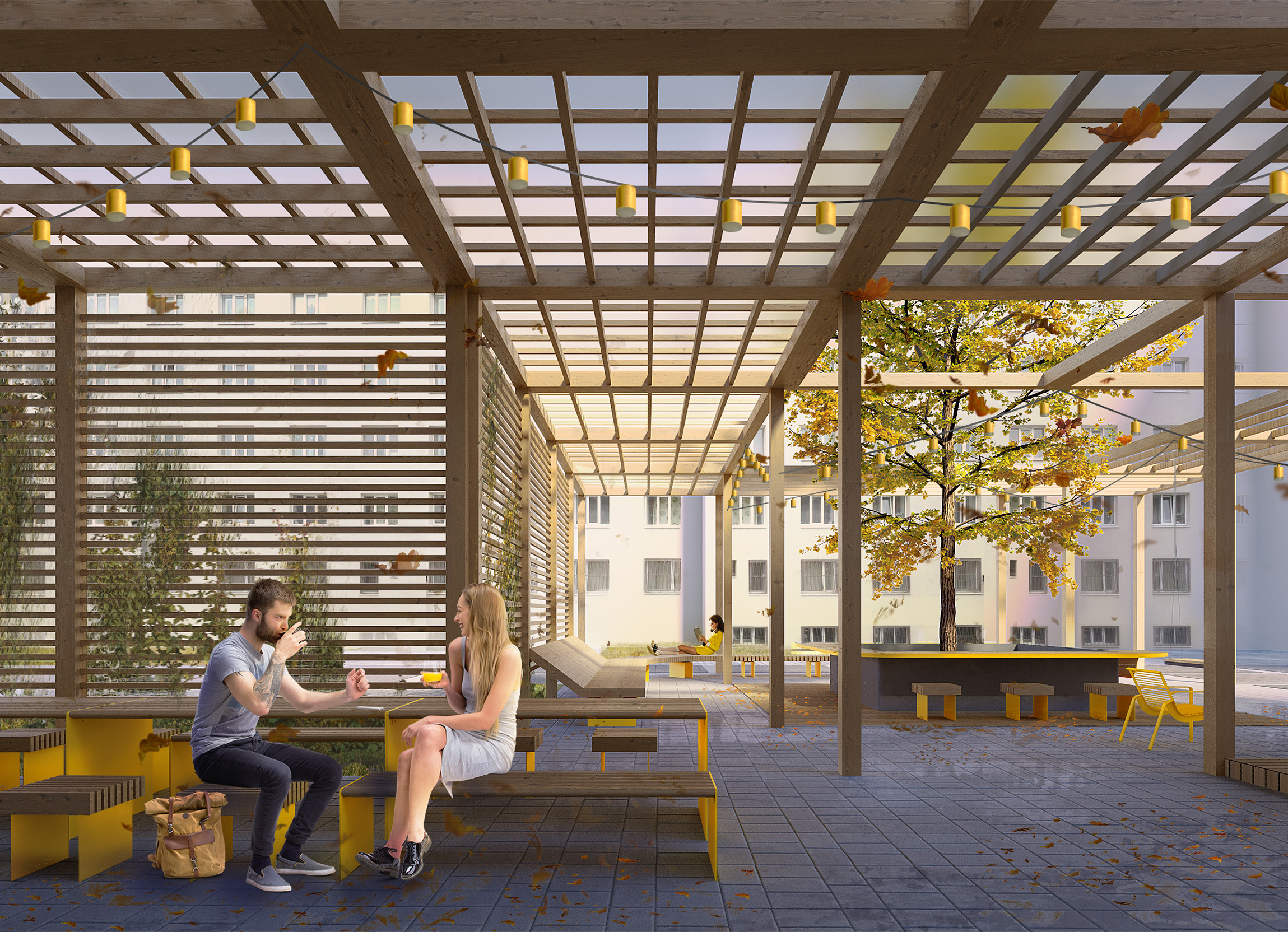Эти пространства станут местом встреч, общения, творчества и отдыха. Для этого авторы предлагают объединить в проекте атрибуты домашнего уюта и разные сценарии использования уличного оборудования.