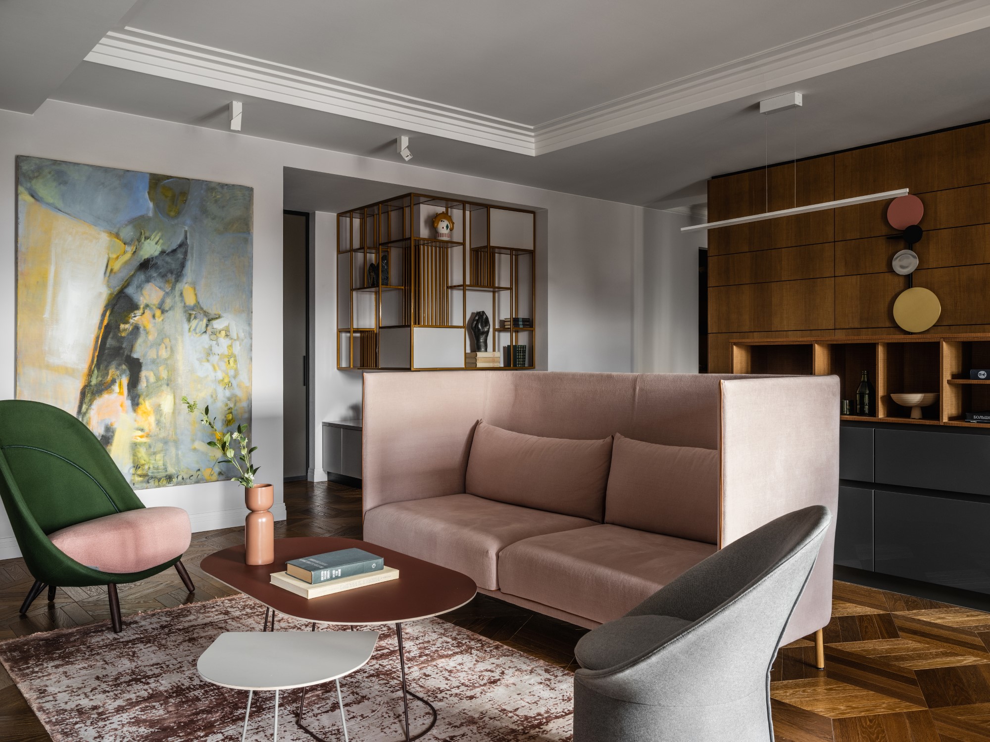 Квартира площадью 200 кв.м для большой семьи получилась с нетривиальным планировочным решением. Здесь 4 спальни, 2 кабинета, 2 гостиные: одна - семейная с open-plan кухней, а вторая - тихая, с фальш-камином, для уединений. Помещения расположены так, что можно ходить даже не кругами, а восьмерками. Почти в каждой комнате - иконы скандинавского дизайна и, конечно же, искусство. В гостиной - большая работа Аси Феоктистовой, в спальне - диптих Сурена Айвазяна, его же работа в желтой комнате, в кабинете - скульптура Василия Исакова.