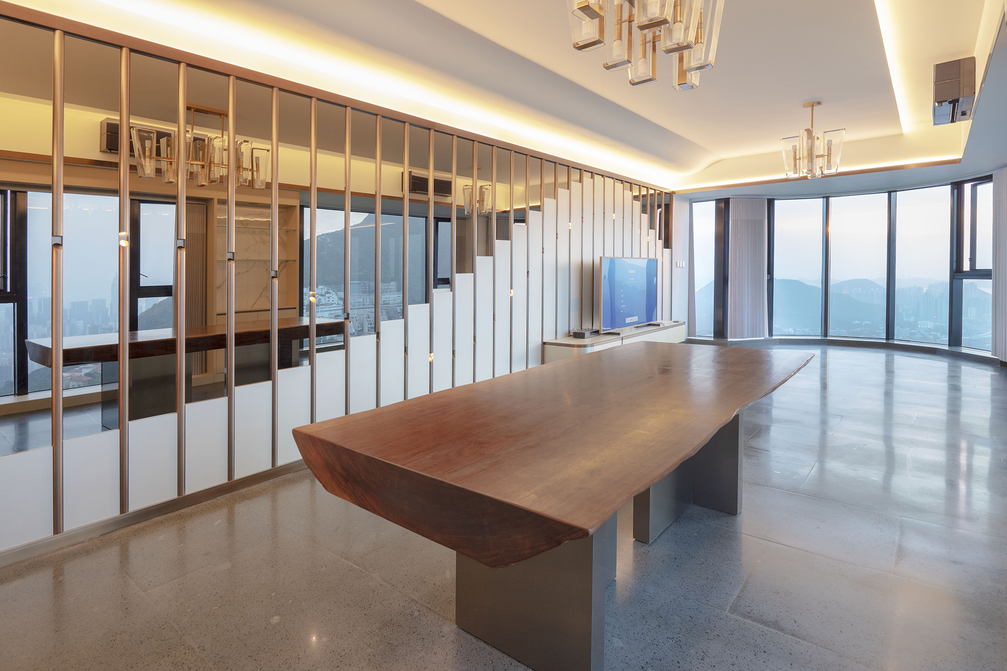 Опроекте: Дом расположен в окружении резко контрастирующих городских и природных пейзажей, и именно это послужило источником вдохновения для автора при планировании его интерьеров. Акцентная стена из металлических и зеркальных панелей словно продолжает горные пики, а также отражает местные виды. Декоративные капсульные светильники имитируют уличные фонари, а ночью напоминают карту звездного неба. Потайная дверь в зеркальной стене ведет из общественных зон дома в личные покои.