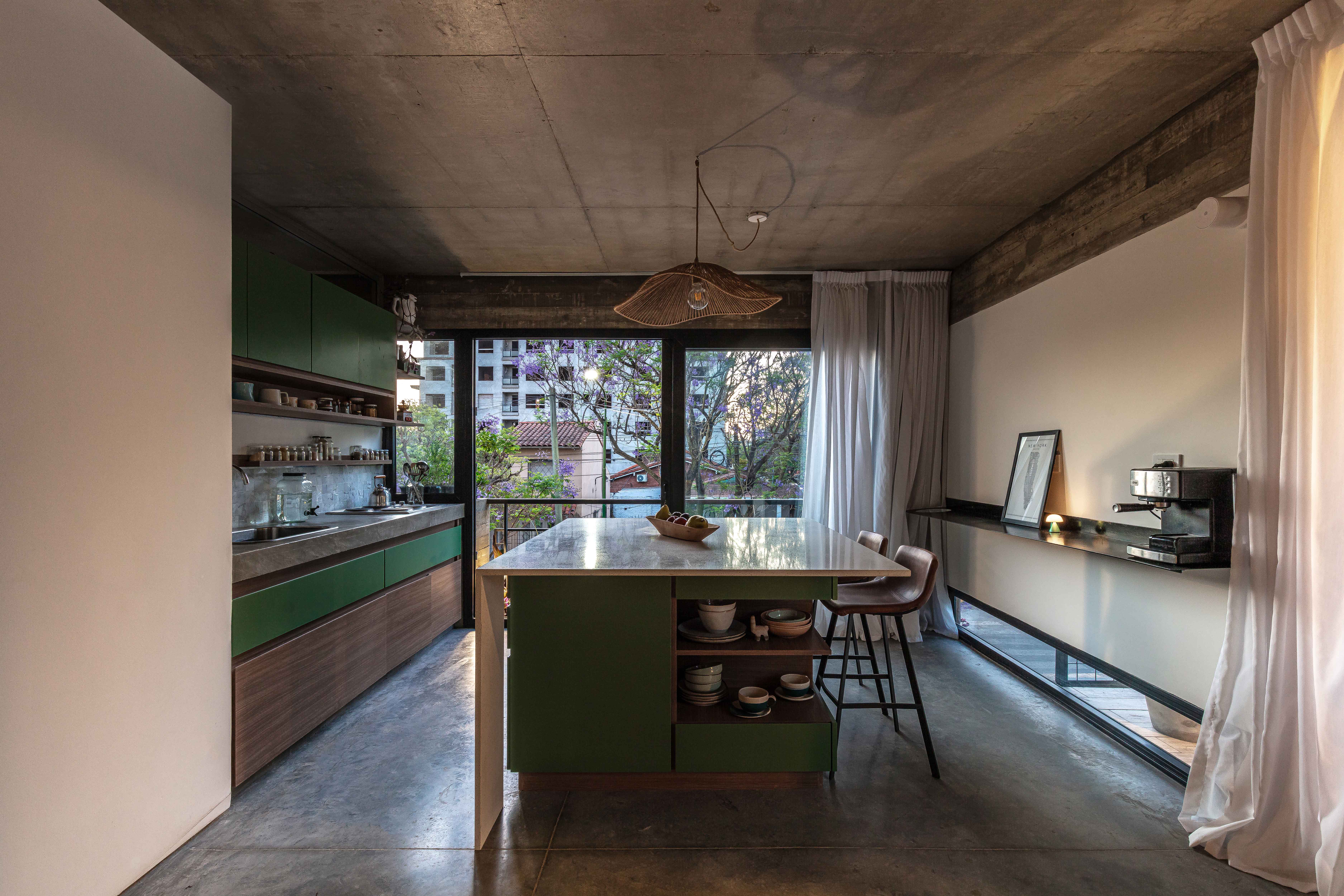 О проекте: Несмотря на то, что основными материалами в интерьере стали необработанный бетон и стекло, кухонные фасады характерного золотисто-коричневого цвета стали изюминкой проекта. В кухне есть все необходимое – духовой шкаф, закрытые полки и кварцевая столешница от одной стены до другой. Кухонный стол можно использовать в качестве рабочего места. Для этого он оснащен скрытыми розетками. Здесь для каждого предмета предусмотрено свое место, так, например, кофемашина размещается на специально предусмотренной для нее подвесной металлической полке.