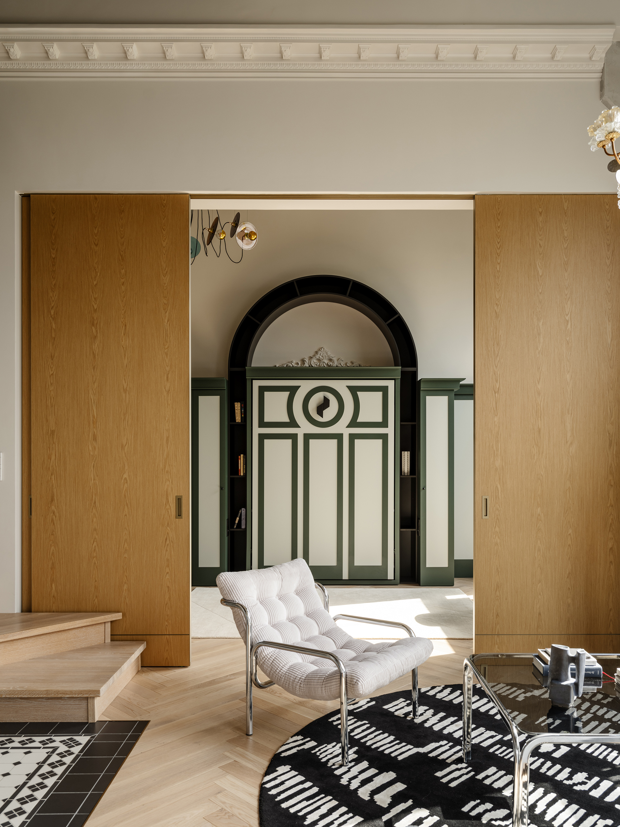 Описание проекта, предоставленное заявителем: Концепция проекта опирается на историю локации: жилой комплекс создан на месте бывшей типографии «Детская книга». Девелопер сохранил корпуса, превратив их в современные здания с апартаментами. В интерьере оставлены конструктивные элементы: рёберные плиты, колонны, балки, окрашенные в цвет стен. Это решение продиктовано устройством антресоли с мастер-спальней: низкий потолок исключал зашивку. Второй уровень выполнен в тёмно-коричневом, создающем камерное настроение. Первый в белом, ставшем «полотном» интерьера. Открытая прокладка коммуникаций подчеркнула характер пространства. Зонирование построено на открытости: мобильная перегородка и откидная кровать-шкаф стали функциональными акцентами. Стеклоблоки применены в лестничной зоне и кухонном фартуке, добавив света. Для хранения задействованы шкафы под лестницей и по периметру, включая антресоль. Стиль квартиры — эклектика, объединяющая конструктивизм, модерн и классику.