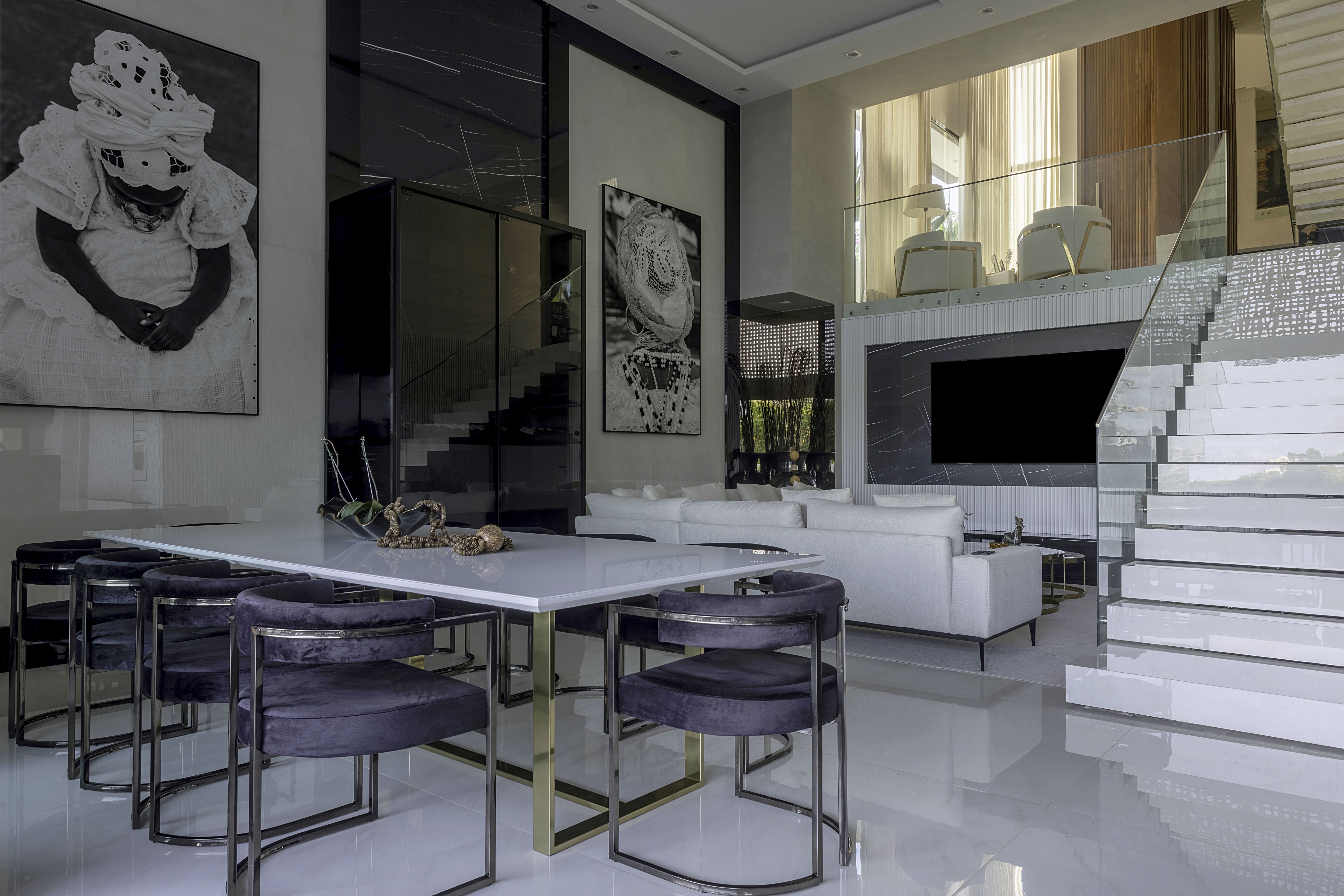 В этом проекте особенности участка, а именно – заметный перепад высот – стали частью дизайн-концепции. Именно так в нем появились двусветные фойе и гостиная, расположенные на разных уровнях. Интерьеры выполнены в современном стиле, а выбор материалов (например, таких как каррарский мрамор, черный мрамор Nero Marquina и фактурные деревянные панели) обеспечивает стиль и уют. Черный гранит и рифленые белые панели выгодно оттеняют друг друга, а использование деревянных решеток «Машрабия» создает причудливую игру светотени на стенах, полах и потолках. Выбору материалов авторы уделили особое внимание, и результатом стало идеальное сочетание природных и современных элементов.