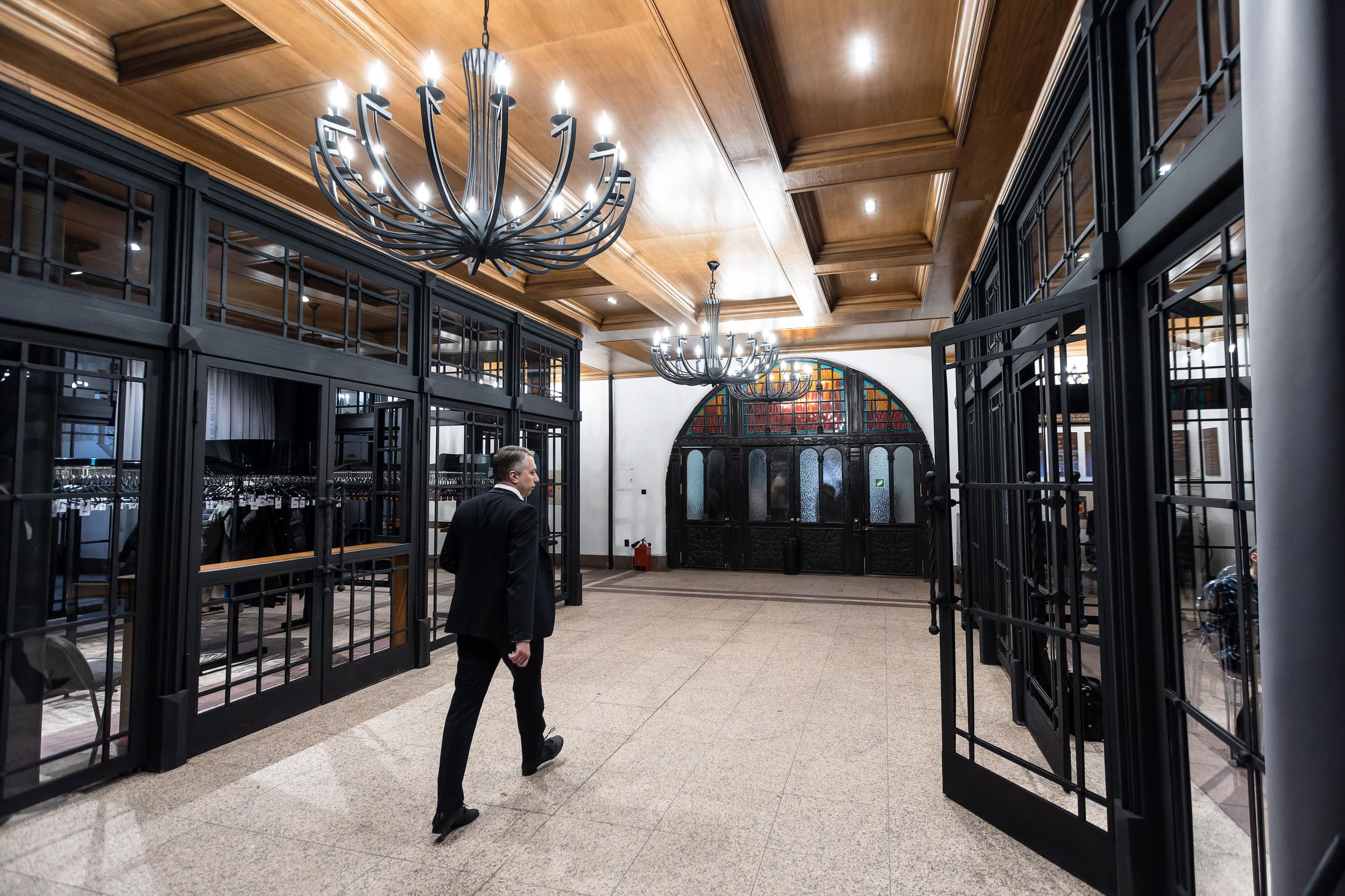 О проекте: Проектом предусмотрено устройство аванзала под пространством большого органа, сочетающего функции вестибюля концертного зала с гардеробом, проходами в зал и объемом малого выставочного пространства. Из аванзала предусмотрен проход к туалетам, которые находятся вне объема собора. Архитектурные решения пространства аванзала приняты в каркасном исполнении из металлических конструкций. Вертикальные линии состоят из профильного метала с заполнением из стекла, что придает воздушность и легкость стенам вестибюля. Цветовые решения ограждений аванзала исполнены в матовых красках темно-графитовой гаммы. Жесткость и брутальность конструкции перегородок смягчается шторами из серой ткани, тянущейся от потолка до пола складками. Несущие колонны фронтальной части конструкции окрашены в глубокий матовый черный цвет. Сумма архитектурных решений эффектно контрастирует с барочным декором главного органа.