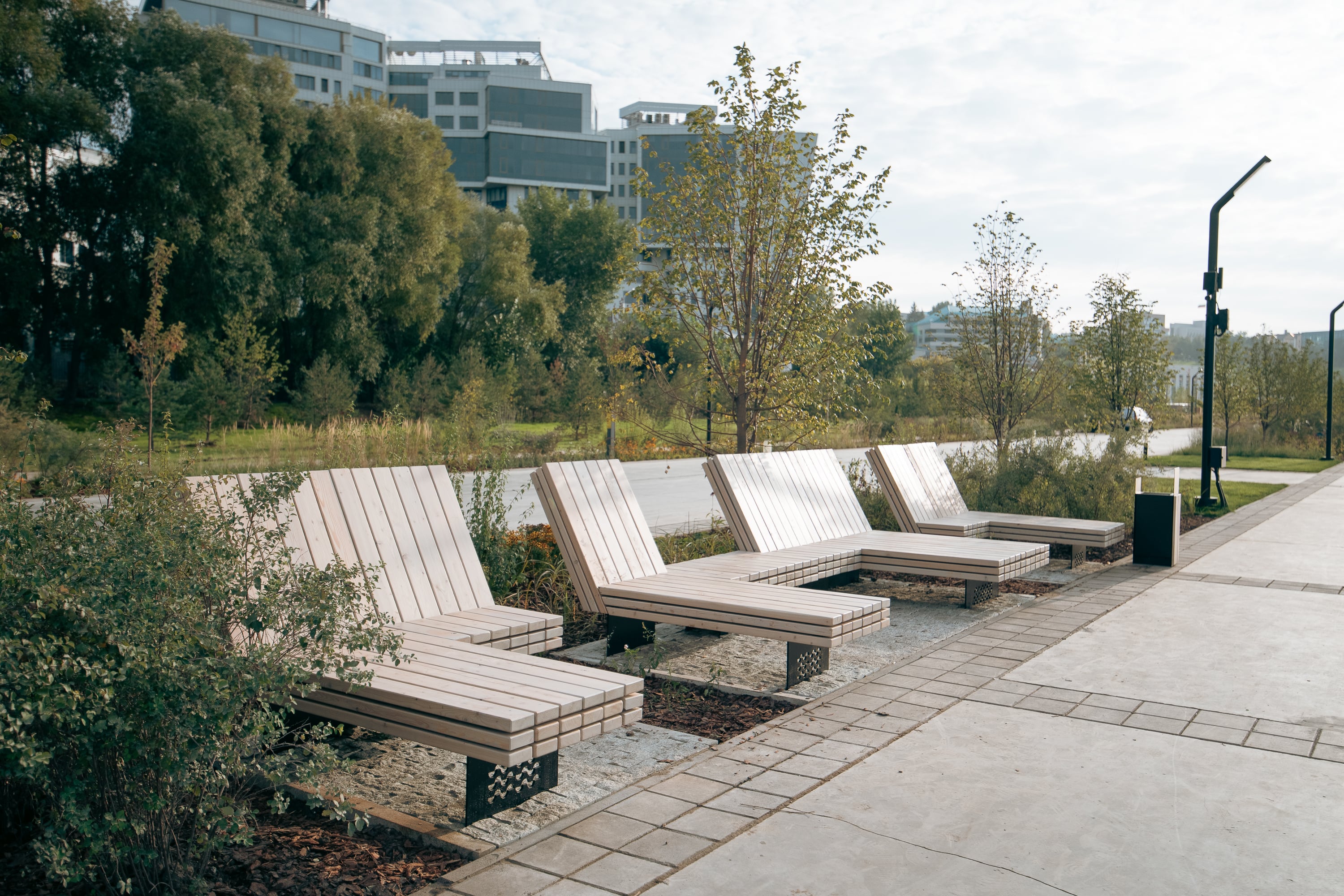 Новое озеленение смягчает бетонную структуру набережной: «зеленые островки» с местами для отдыха и видовой «зеленый амфитеатр» с деревянной рампой, которая позволяет перемещаться на средствах микромобильности.