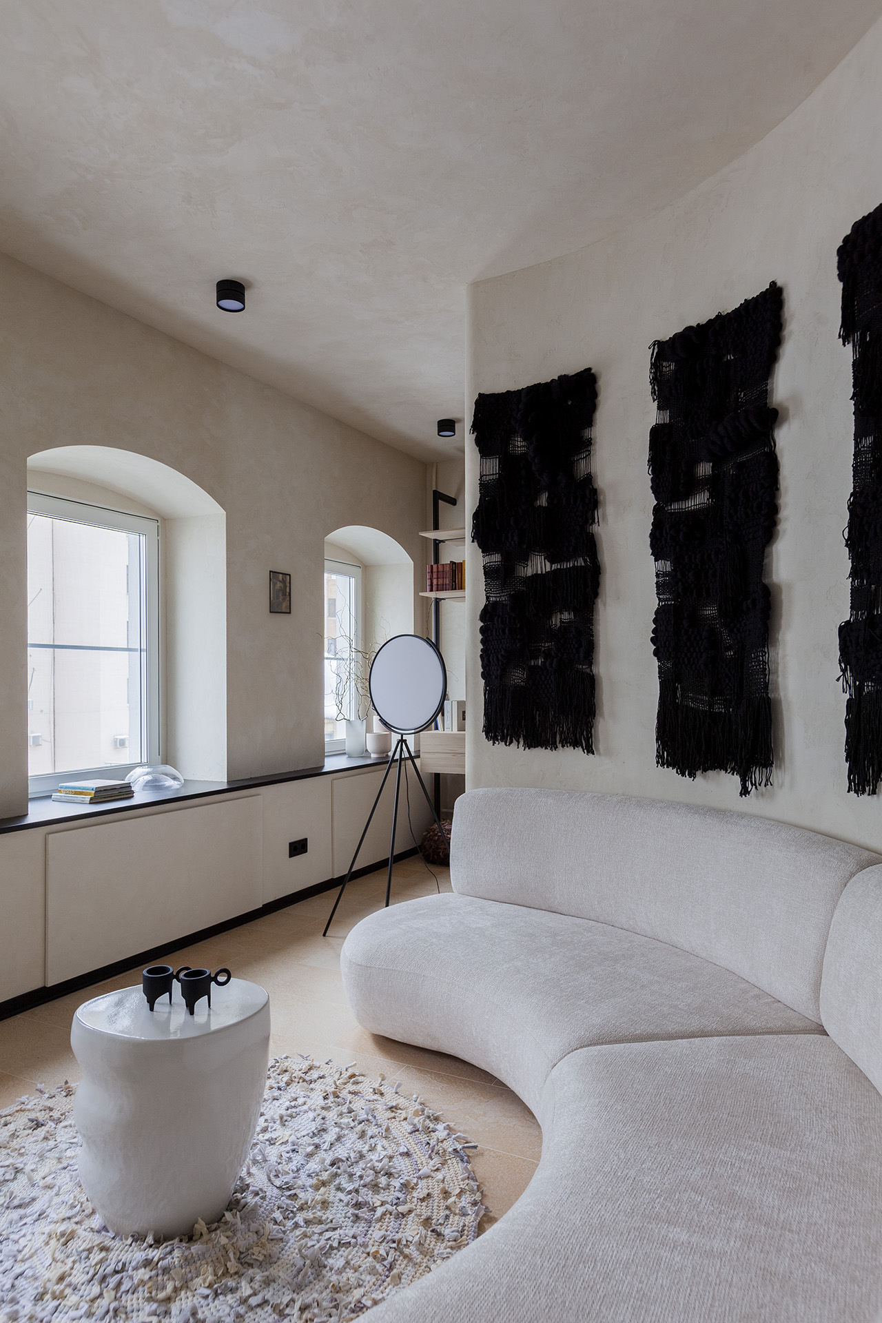 Вместительный шкаф в прихожей визуально «растворили» - мебельные фасады покрыли тем же составом, что и стены, дополнительно скрыв несущую балку и сместив акцент на фальш-колонны. В транзитной зоне для разнопланового хранения устроили скрытый шкаф с ручками-пуговками, его «камуфлирует» штукатурка.