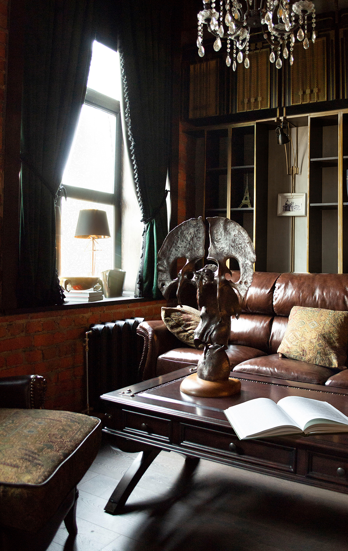 Интерьер лофта включает не только эффектные дизайнерские решения, но и произведения искусства, создающие более глубокие смысловые акценты и точки притяжения. Среди них представлена скульптурная пластика известного художника Даши Намдакова, в том числе работа «Воспоминания о будущем», вдохновленная древними верованиями и соединяющая современное и вневременное.