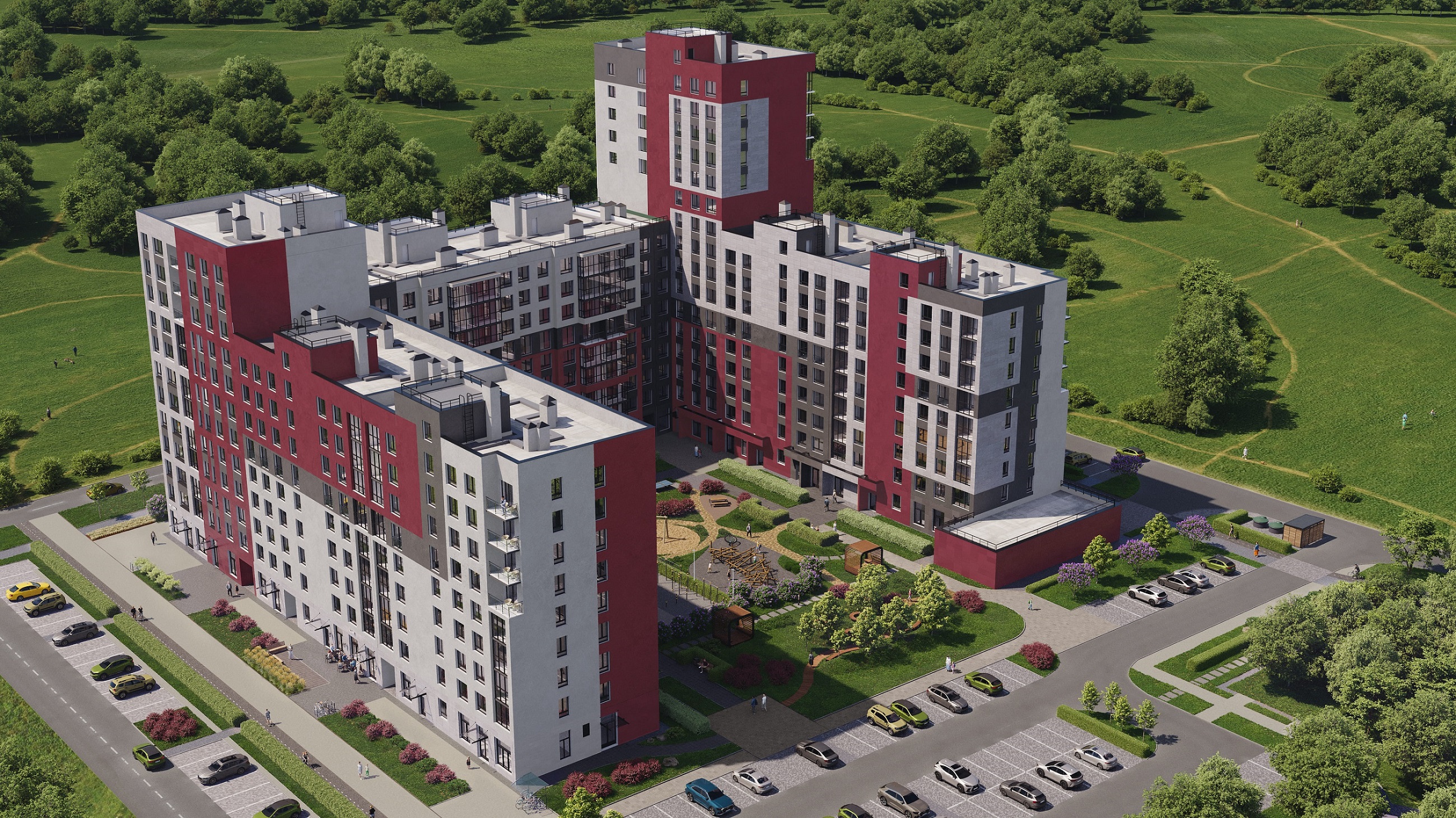Во внутренних дворах жилого комплекса «Счастье в Кольцово» оборудованы игровые площадки для детей, зоны со спортивными тренажерами, предусмотрены тихие пространства для занятий гимнастикой или йогой. На территории размещены велопарковки, уютные места для отдыха и сенсорный лабиринт с широким ассортиментом используемых покрытий.