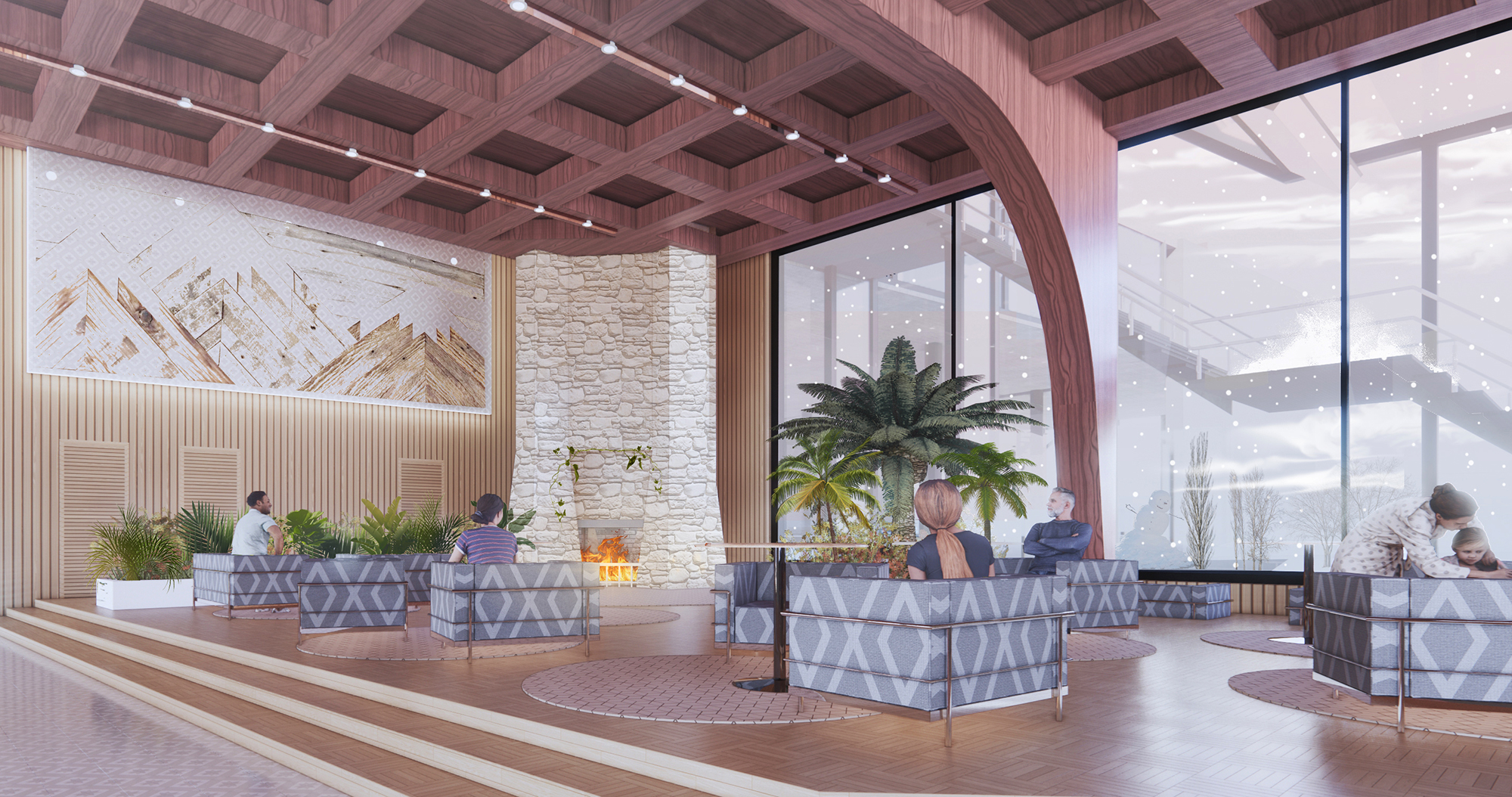 Доминантным архитектурным элементом объекта является объем гостиницы со скатной кровлей, облицованный CLT-панелями бордового оттенка. Здание гостиницы декорировано деревянными резными элементами и контрастирует с общим объемом комплекса, так как выполнено в стиле традиционной северной архитектуры. Общий объем здания представляет «современную архитектуру» и имеет обильное остекление, а также облицован металлическими панелями черного цвета.