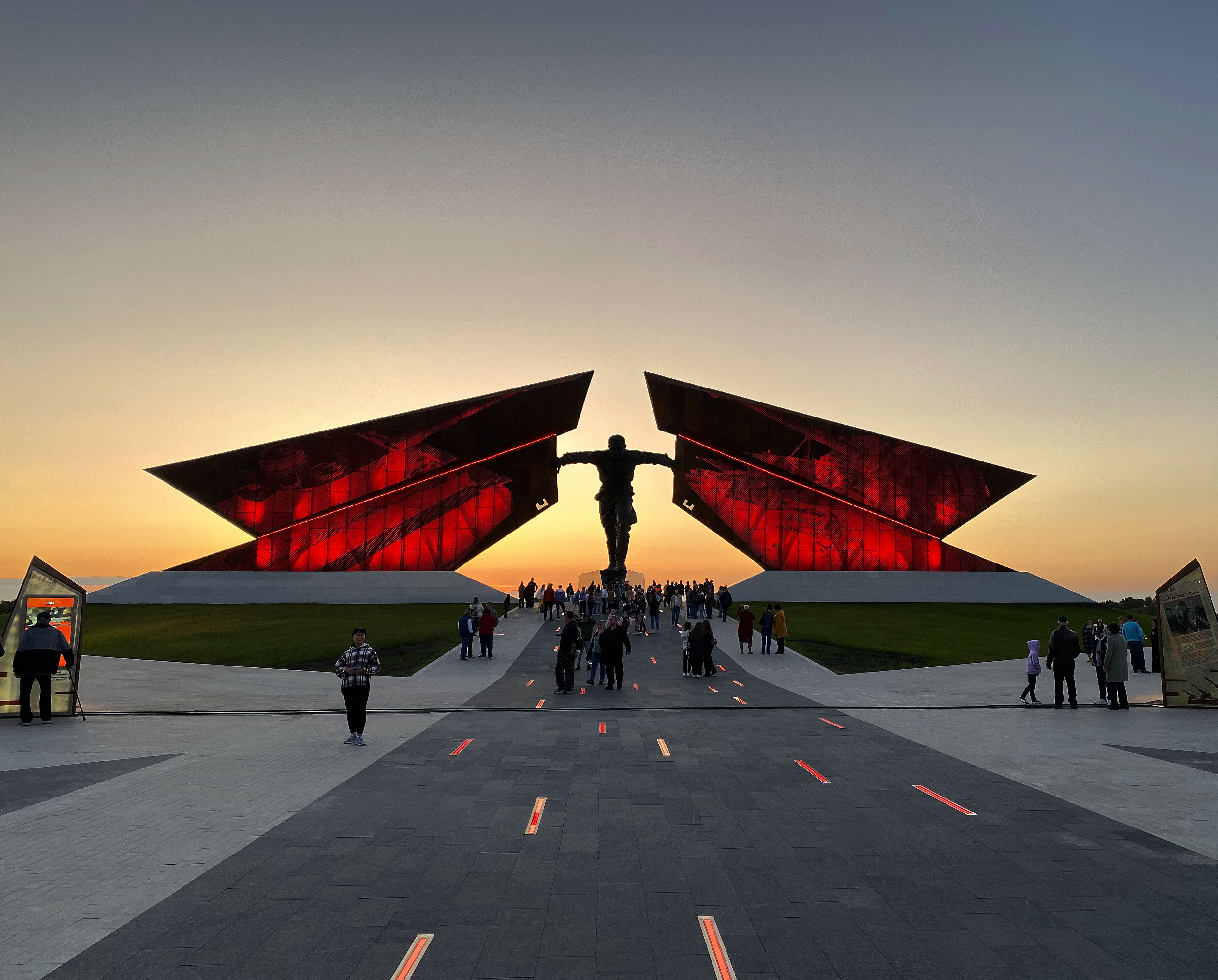 В дорожке, ведущей к стеле установлены встроенные в грунт RGBW-светильники. Переливы от оранжевого к красному создают иллюзию летящих пуль и стрельбы.