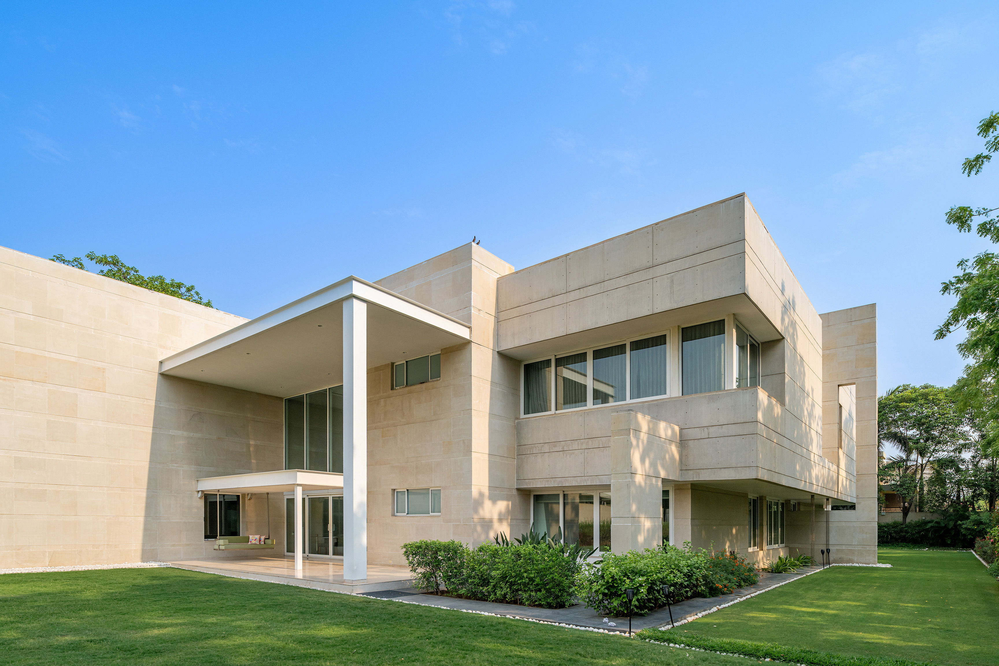 Описание проекта, предоставленное заявителем: Вилла Lakhani в Ахмадабаде демонстрирует спокойный модернизм, объединяя минималистичную геометрию с жизнью, интегрированной с природой. Фасад из бежевого и белого песчаника с открытым бетоном создает смелое бруталистское впечатление, смягченное просторными остекленными поверхностями. Вход отмечен эффектным навесом, а линейная стена с отверстиями создает интригу, одновременно скрывая и открывая сад. Двухуровневый проход делит дом на общественную и приватную зоны, а его строгость оживляют настенные росписи.