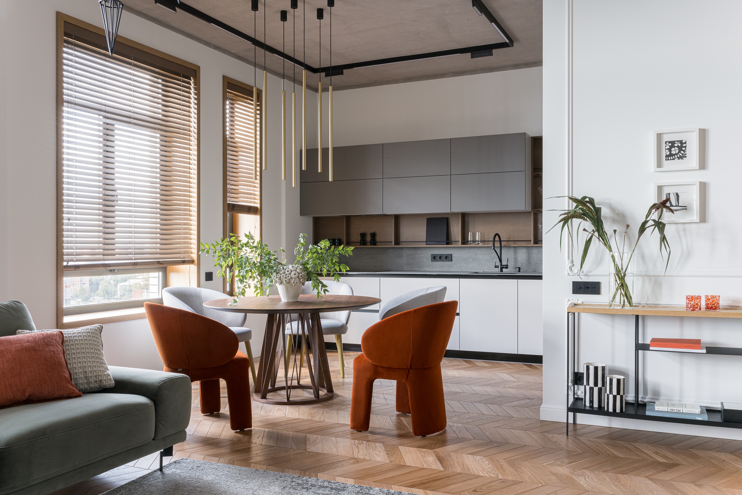 Квартира создавалась для семьи с двумя детьми и собакой. Семья очень динамичная, родители – собственники разных бизнесов, дети учатся в школе и занимаются профессиональным спортом, часто бывая на сборах и соревнованиях. Часто путешествуют. У всех членов семьи очень активная жизнь и квартира должна была отражать это, при этом быть очень уютной – местом силы.