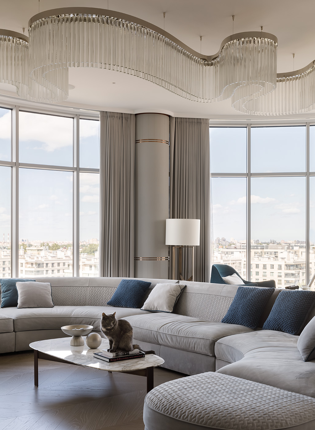Сложная конфигурация пространства гостиной с несущей колонной по центру и полукруглым периметром окон повлияла на структуру всего интерьера: мебель расположена свободно, а функциональные зоны перетекают одна в другую. Подчеркивают плавность пространства цветовое сочетание, основанное на сближенных жемчужно–серых тонах, диванная группа со скругленными формами и двусторонней ориентацией на панорамный вид и зону ТВ. Главным акцентом и объединяющим все зоны элементом стал масштабный волнообразный светильник, выполненный на заказ итальянской фабрикой.