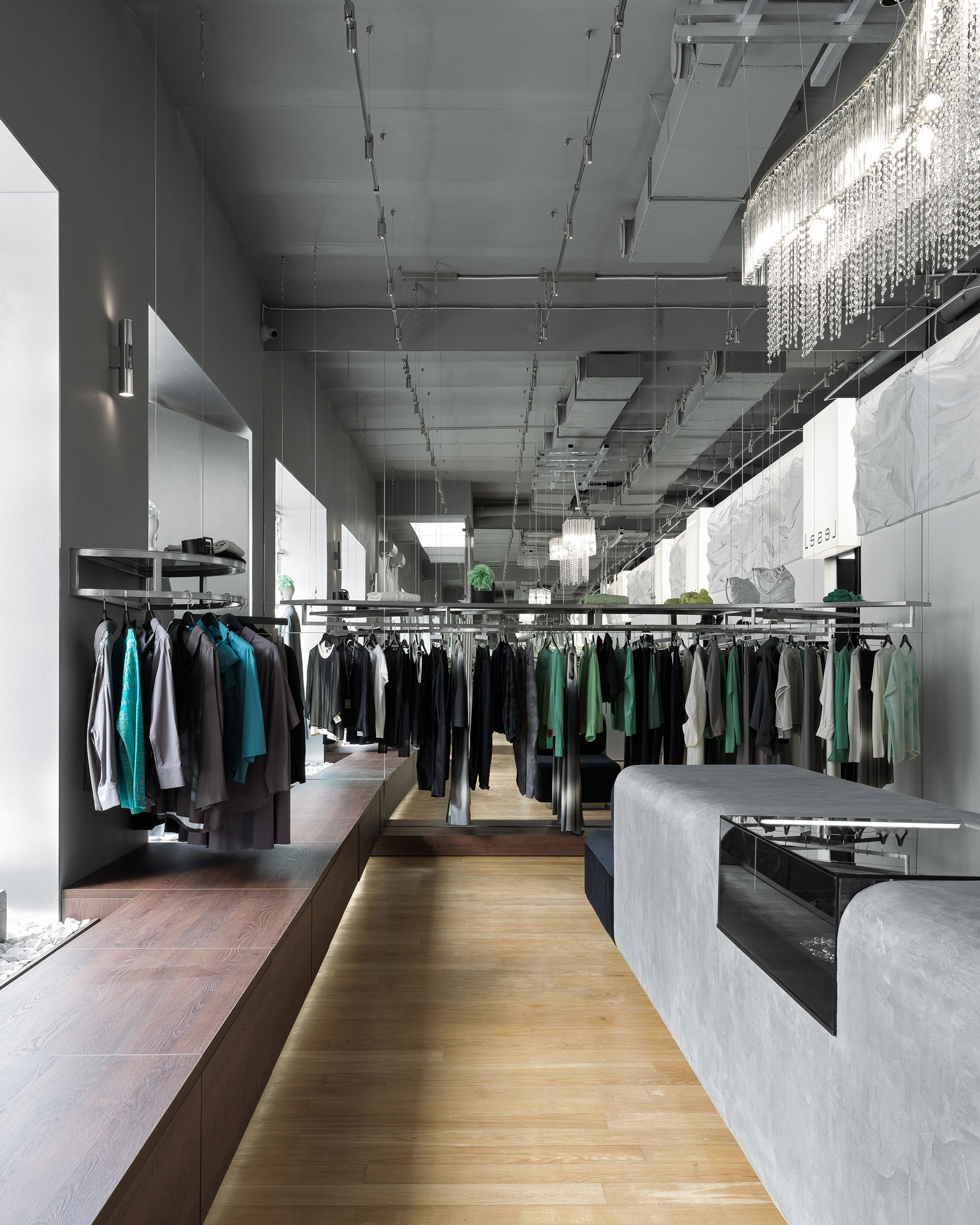 Интерьер предназначен для магазина женской одежды LESEL. Ключевой акцент дизайна — декоративные барельефы, размещённые в подпотолочной зоне стен. Их плавные и объёмные линии создают динамичный ритм, расширяя пространство и подчёркивая утончённую концепцию бренда.