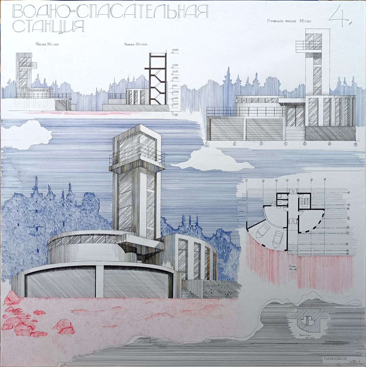 Описание проекта, предоставленное заявителем: Здание спроектировано для обеспечения безопасности и предоставления первой медицинской помощи для людей на пляже. Материал постройки - бетон. Имеется перепад высот в виде 1,5 м, который осуществляется с помощью лестницы и внедрения станции в стену. В проекте имеются: вестибюль, комната для персонала, мед.кабинет, эллинг, душевая, с/у и смотровая башня.