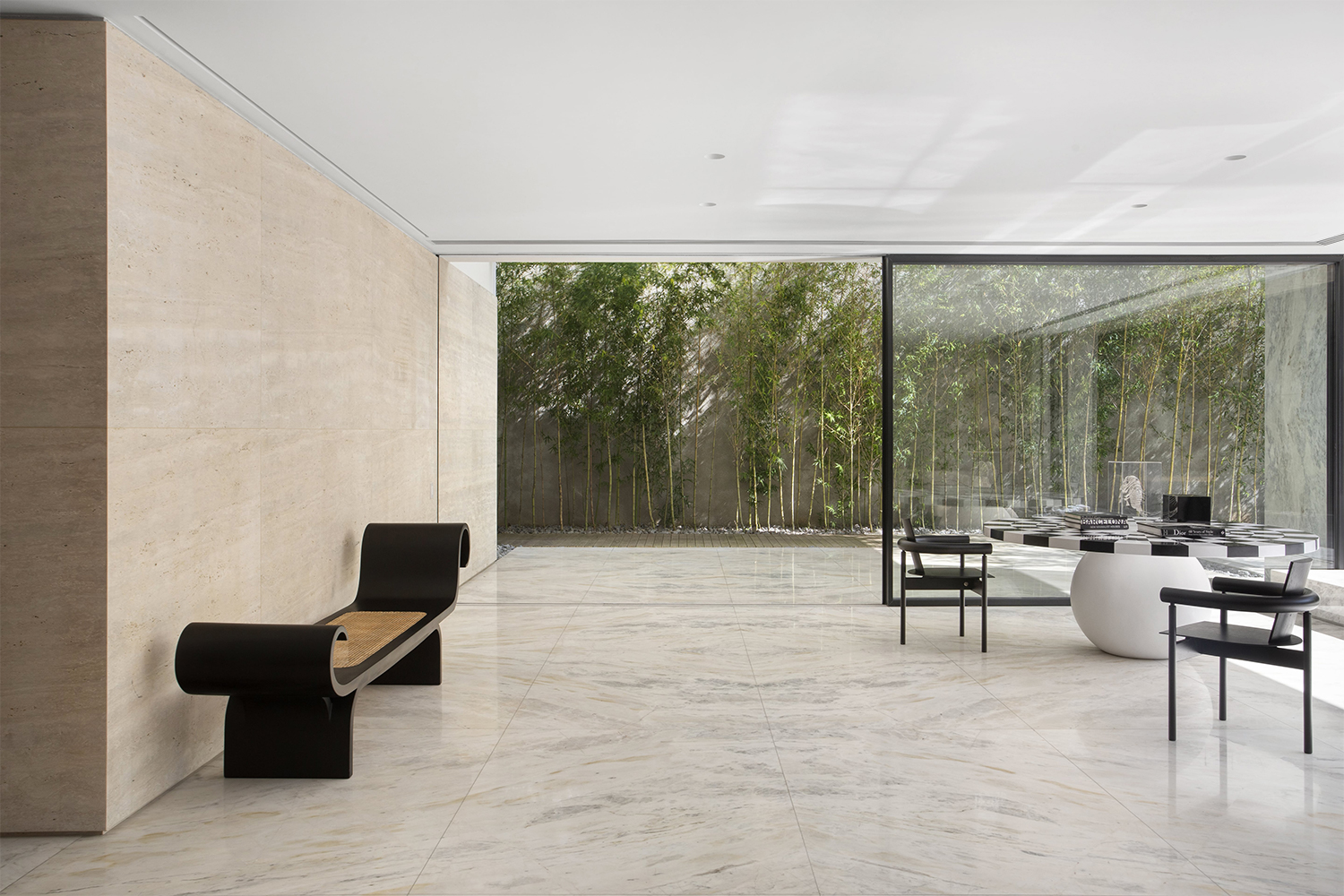Владельцу хотелось, чтобы дом стал более ярким и чтобы в отделке преобладали отражающие материалы. Авторы проекта остановили свой выбор на остеклении в алюминиевой раме и белом мраморе, а для фасадов предпочли белый известняк.