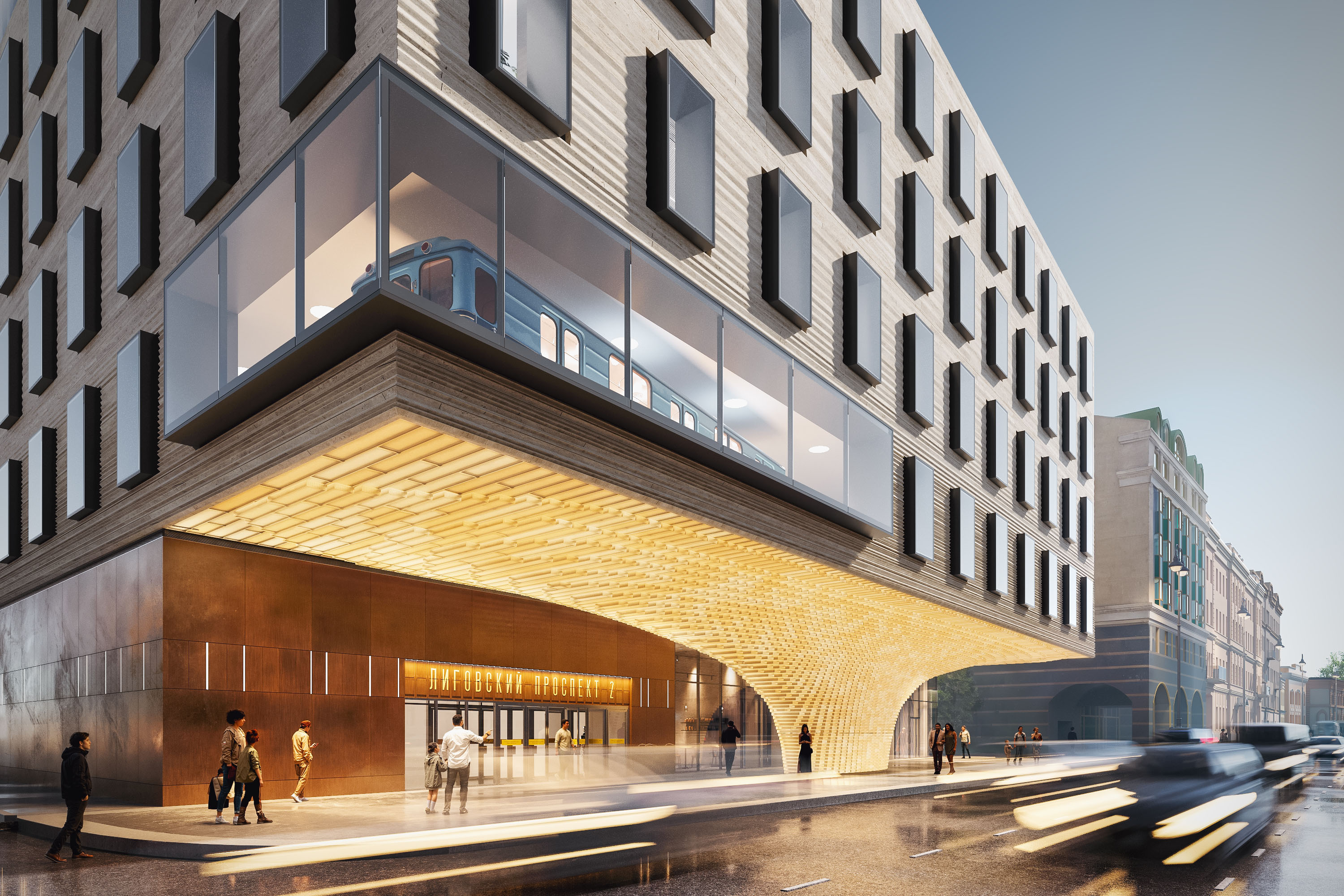 Вестибюль станции «Лиговский-2» задуман как объект, учитывающий характер проспекта и формирующий новый акцент в городской среде. Проект опирается на индустриальный дух района, традиции брандмауэрной застройки и интенсивный транспортный поток, требующий ясной артикуляции входа. Композиция строится на трёхчастной системе: глубокий первый этаж, чёткий основной объём и лёгкий аттиковый ярус. Фасад решён в ритме окон-эркеров — современной интерпретации классического приёма; его дискретность нарушает витрина музея метро. Главный акцент — колонна-атлант из стеклоблоков или керамики, символизирующая движение и энергию транспорта и отсылающая к Лиговскому каналу, колоннам «Автово» и петербургским атлантам. Фасад со стороны вокзальной площади трактован как театральная декорация: волнообразные поверхности с мотивами железнодорожной тематики создают глубину, скрывают инженерные помещения и формируют динамичный современный облик.