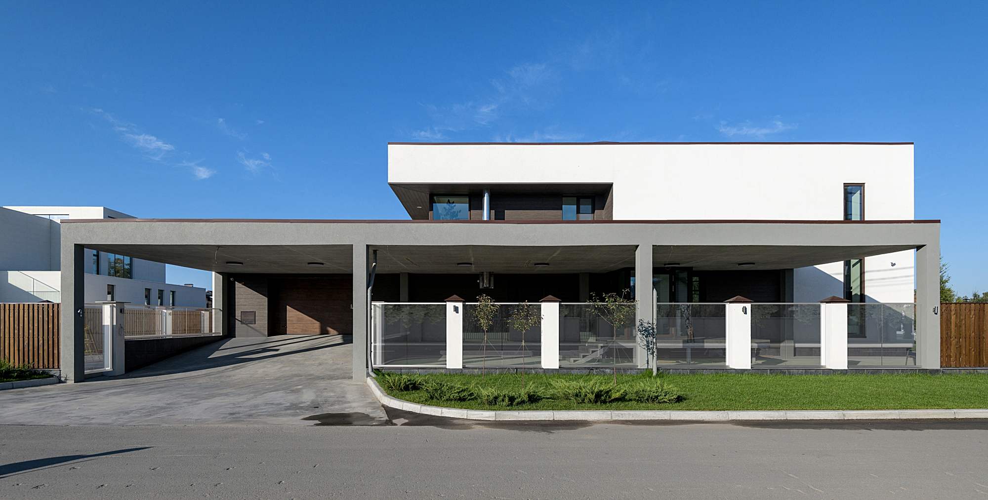 О проекте: Просторная современная вилла в коттеджном поселке «Морской берег» под Новосибирском для молодой активной семьи с двумя детьми. Творческая группа архитектора Буслаева вела проектирование дома (общая площадь около 600 кв.м), интерьеров и ландшафта в течение почти пяти лет. Дом имеет два надземных и один подземный этаж, вписан в участок так, чтобы максимально оставить место для благоустройства и рукотворного «леса» на участке. Г-образная структура планировки включает в себя высокое двусветное, остекленное с двух сторон пространство парадной зоны (гостиная + столовая+ кухня + каминная зона с открытой лестницей) и двухэтажный жилой блок (на втором этаже расположены спальни и детские комнаты с ванными, под ними гостевые комнаты и различные хозяйственные помещения). В парадной зоне виллы регулярно организуются дружеские вечеринки по различным поводам, при этом само пространство четко зонировано при помощи контрастных материалов и цветов на кухонную и каминные зоны.