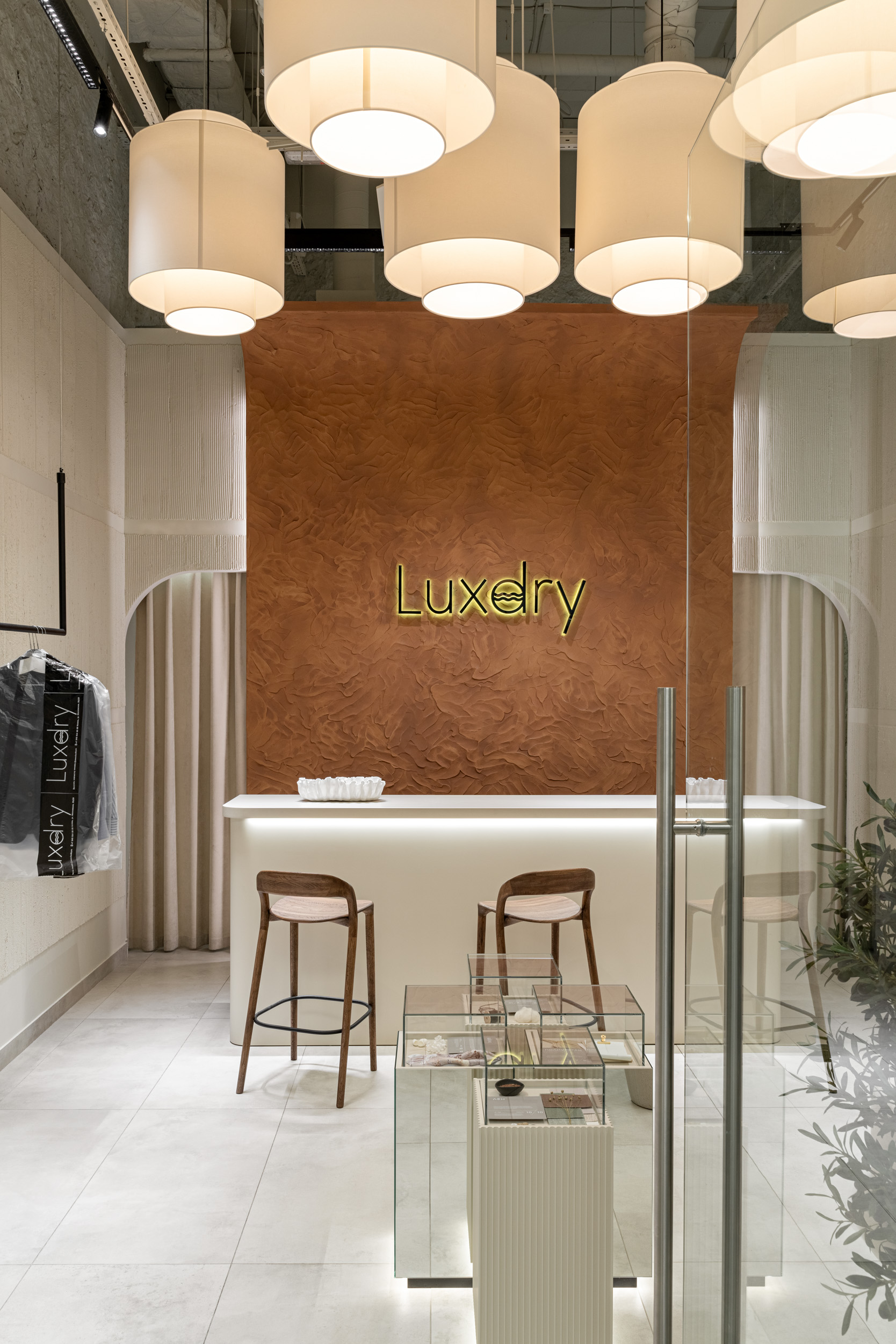 Бюро дизайна интерьера CV HOME спроектировало химчистку с необычным интерьером. Он выполнен в эклектичном стиле, навеянном мотивами пустынных барханов и дюн в природных оттенках терракота. На 40 кв.м расположились стойка приема вещей, зона ожидания, примерочная и декоративная зона с инсталляцией тканей. Дизайнерам хотелось отойти от стандартного понимания пункта приема химчистки и сделать помещение в первую очередь комфортным и красивым для посетителей.