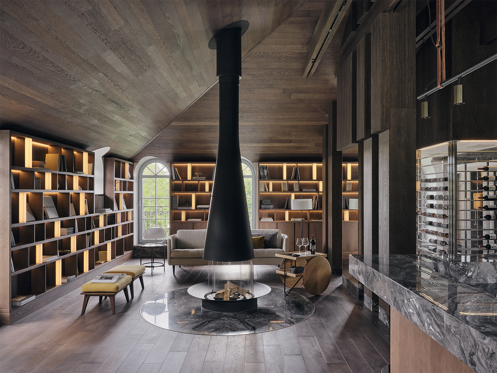 Сердце мансарды ー эффектная зона отдыха вокруг элегантного камина с обзором на 360॰. Натуральный камень, массив дуба, естественный и искусственный свет дополняют друг друга, создавая уютную атмосферу, в которой приятно провести дружескую вечеринку или уединенный вечер с книгой и бокалом изысканного вина.