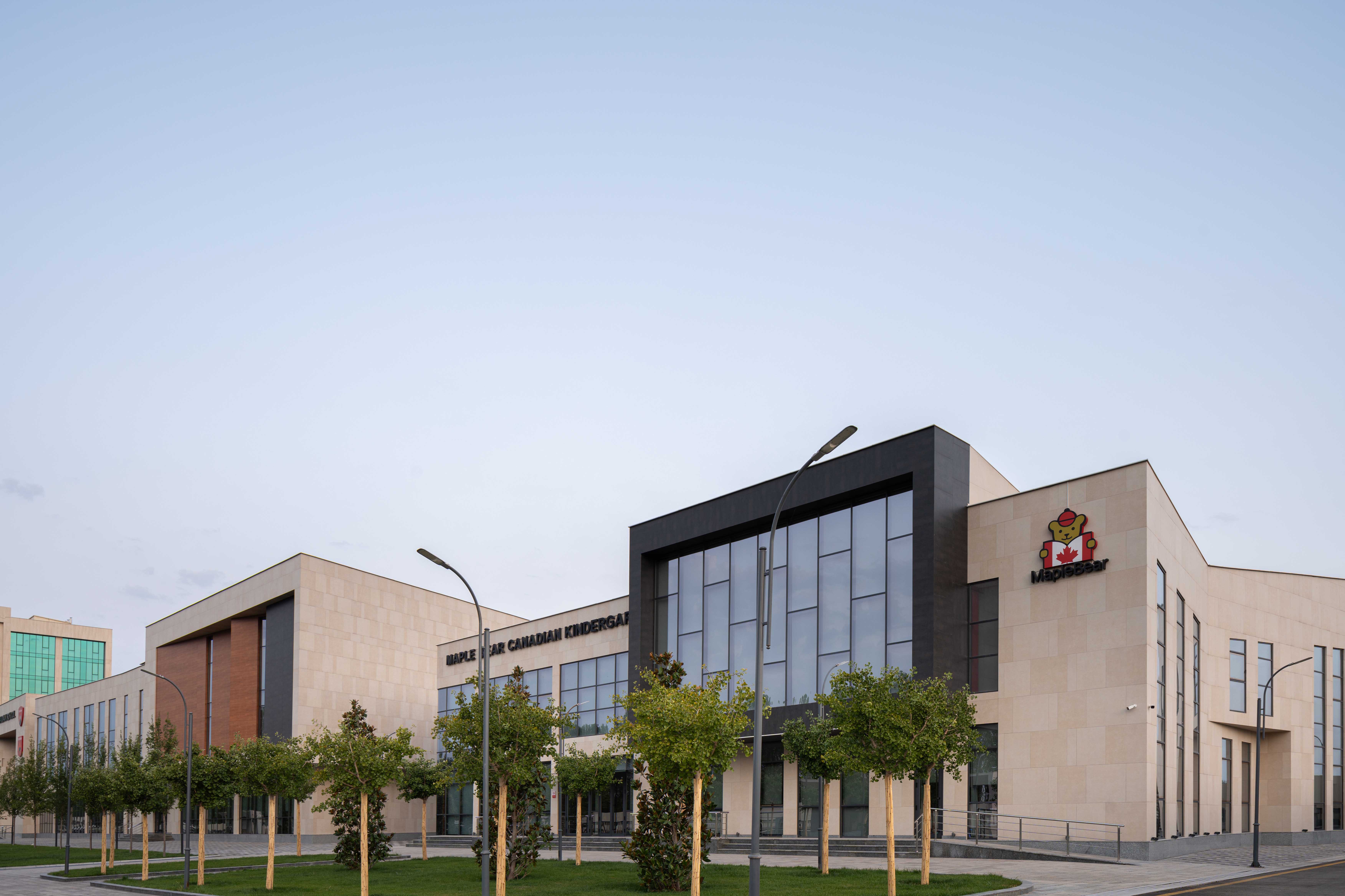 В 2024 году в Ташкенте реализован современный кампус Maple Bear, отражающий философию канадской школы в архитектурном облике. Общая вместимость комплекса – 1000 детей. Просторный участок площадью 3,4 га позволил разместить здания свободно, с учетом удобства и безопасности. Кампус состоит из трех взаимосвязанных блоков, функционально и архитектурно объединённых в единый образовательный ансамбль. Здания школы и сада расположены отдельно, соответствуя возрастным потребностям, но связаны с общественным блоком с помощью крытых переходов. Такое решение обеспечивает единство комплекса.