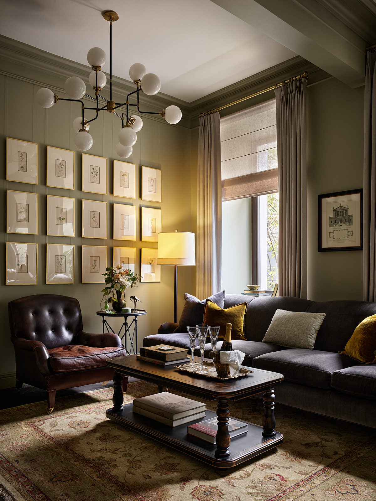 На стене в гостиной расположены 15 великолепных гравюр, которые были созданы по рисункам известного английского ботаника и иллюстратора Джеймса Сауэрби (1757-1822 гг). Каждый оттиск раскрашен от руки акварелью. Причем сделано это невероятно изящно - цветом выделены только некоторые части растения, в то время, как другие оставлены нетронутыми, чтобы в духе времени дать волю воображению. Это было очень кропотливо и дорогостояще, но именно поэтому гравюры из этого издания так ценятся любителями ботанических эстампов. Гостиной гравюры придают воздушность, нежность и ощущение благородного тепла и уюта. Происхождение гравюр: Англия, Лондон, изд. R. and J.E.Taylor 1851 г.