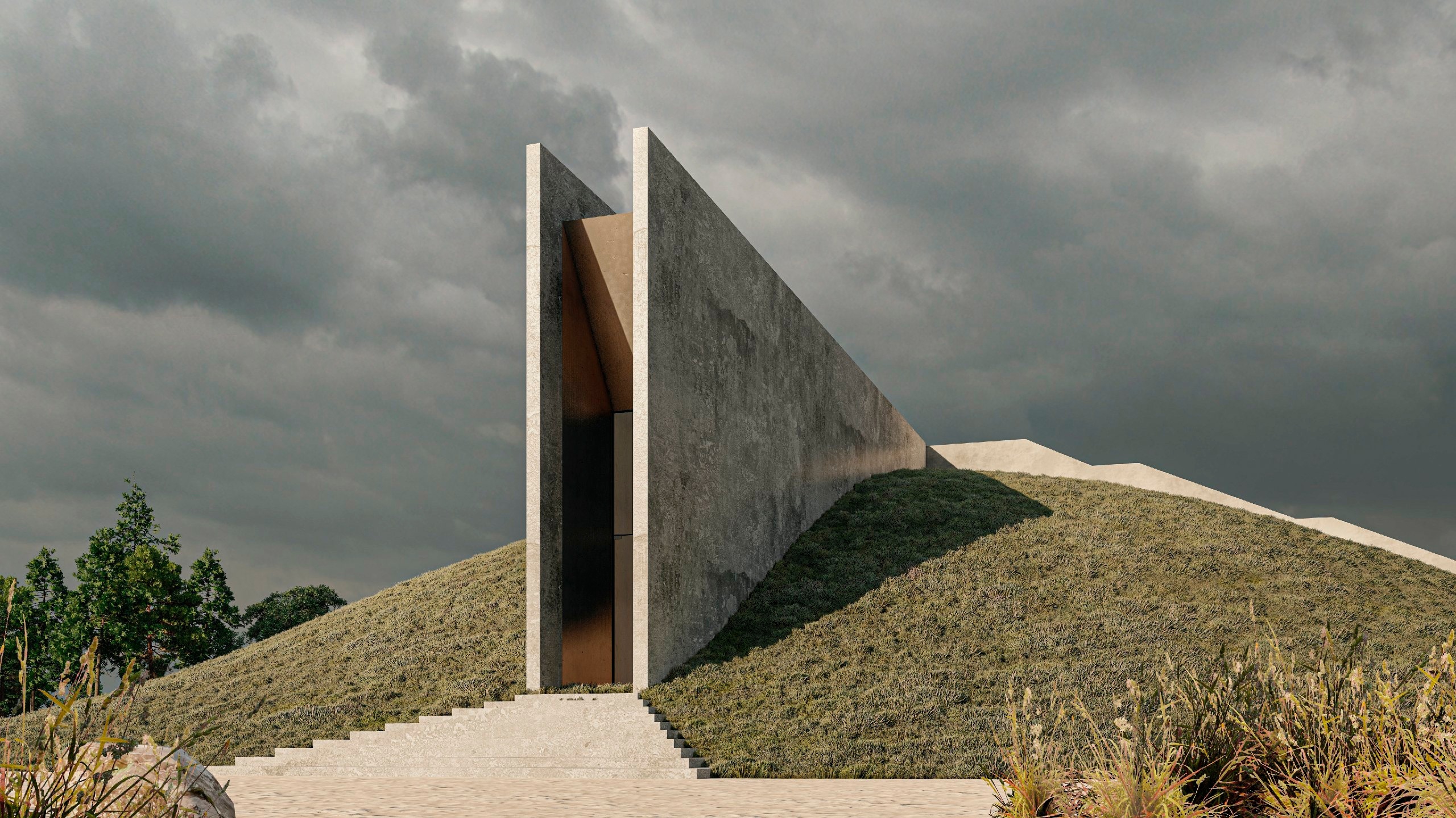 Объект представляет из себя курган (насыпь из земли), прорубленный двумя бетонными плитами, с зальным пространством внутри. Курган - архетипичный для европейской и русской культуры тип воинского захоронения, который несёт в себе множество сакральных смыслов (уход по землю в мир мёртвых, круг в плане символизирующий солнце). Поскольку объект находится в границах водоохранной зоны ладожского озера, применение формы круга, как самой природной формы, кажется наиболее уместным.