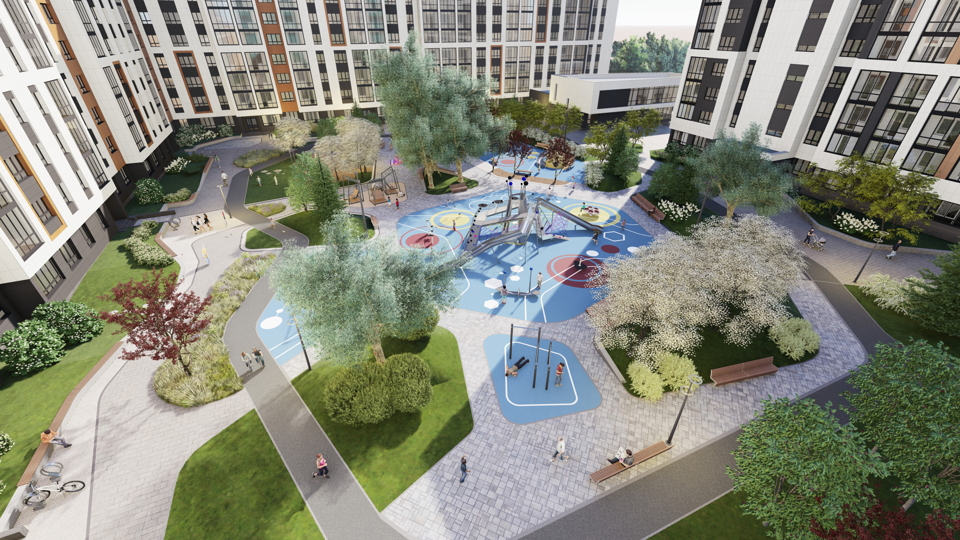 Проект благоустройства всего комплекса предполагает огромную территорию (более 3 га) двора без машин. Все парковки вынесены на внешний периметр и в крытый паркинг. В первом построенном дворе располагается play hub с большим набором детского игрового оборудования для всех возрастов.