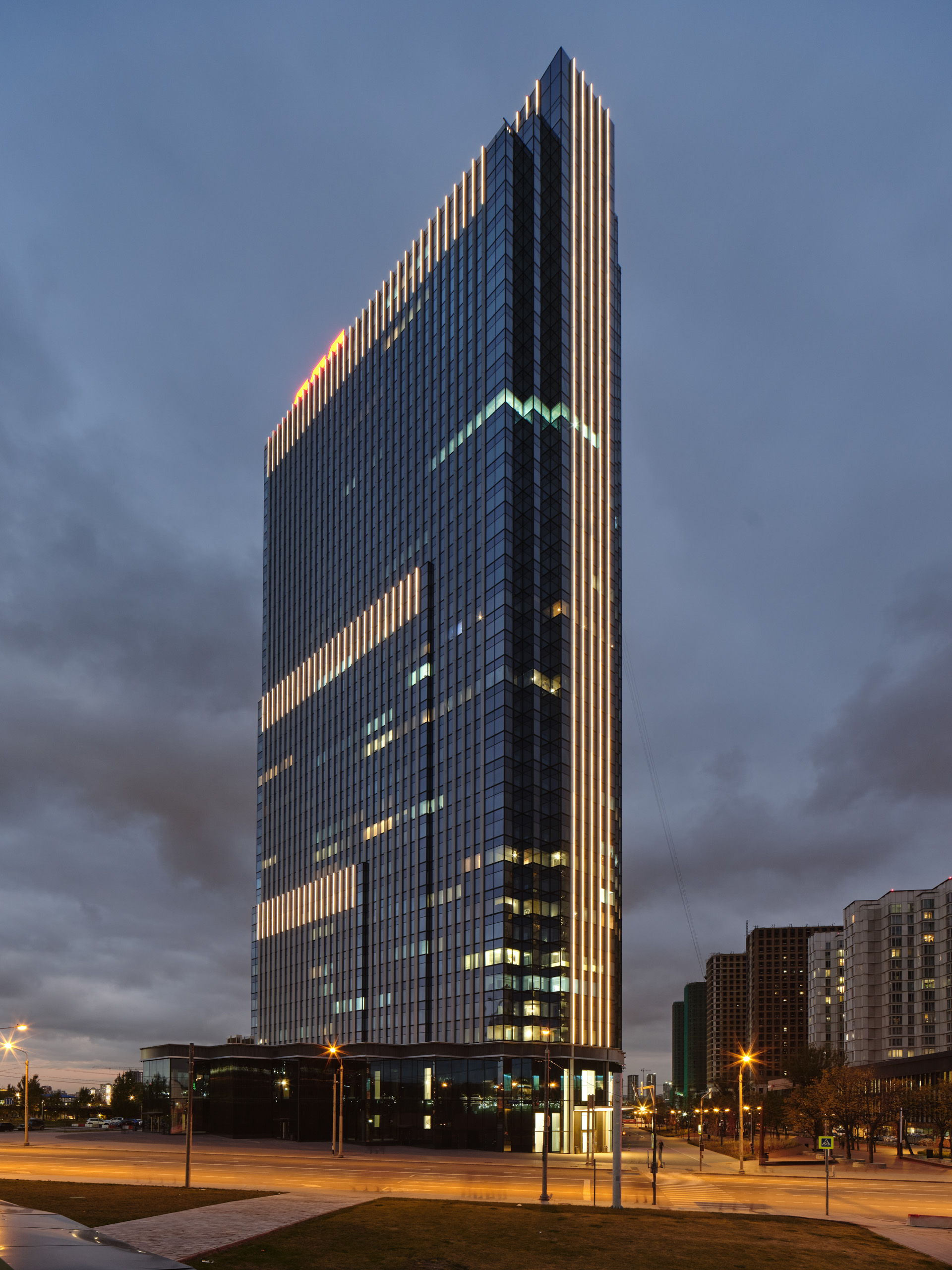 Конструктивные особенности фасадов позволяют интегрировать светильники вровень с внешней поверхностью ламелей, что способствует сохранению чистоты архитектурной формы - основополагающей идеи башни. Таким решением создается сдержанная композиция, в комплексе с контрастными фасадными материалами элегантно подчеркивающая вертикальные линии ZILART Tower ночью, оставаясь незаметной днём.