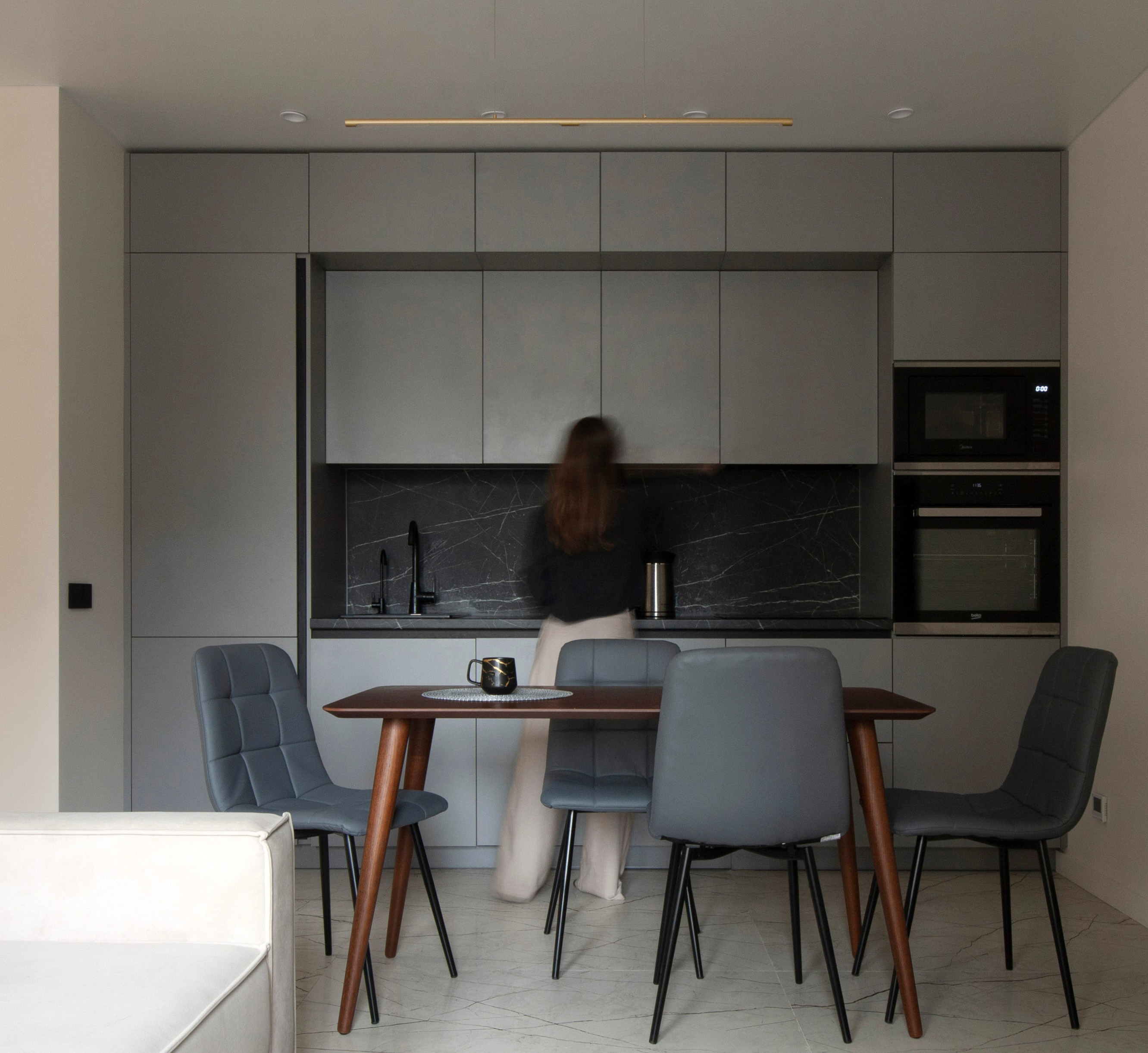 Описание проекта, предоставленное заявителем: Однокомнатная квартира 48 кв.м для молодой пары на Комендантском в светлых тонах с контрастными элементами и темным деревом. Серая кухня с фартуком в текстуре черного камня отлично сочетается с молочным цветом стен и модульным диваном. Черный и белый керамогранит в ванной комнате создает контрасты. Латунные элементы освещения подчеркивают элегантность интерьера.