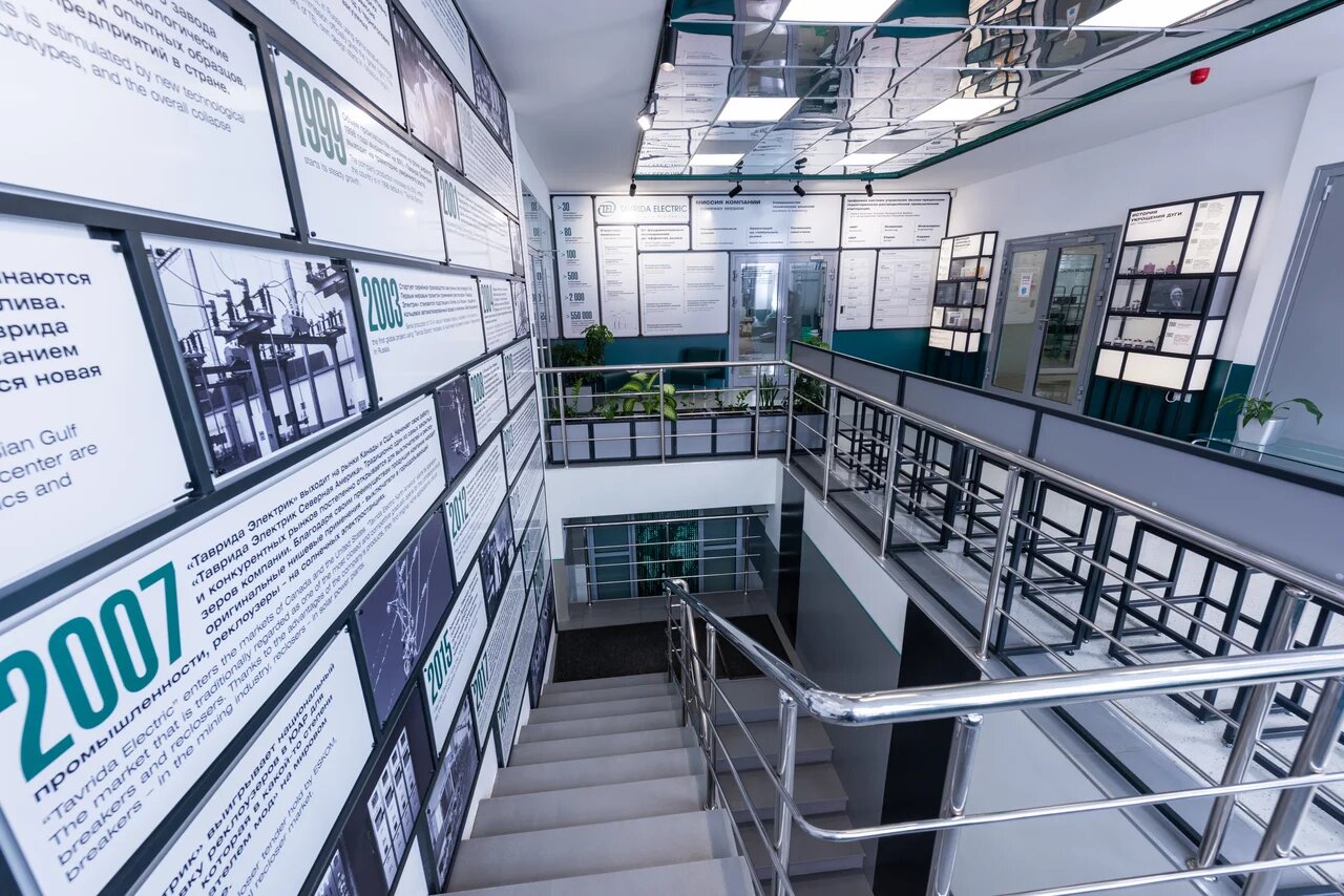 Спроектированы тематические стеллажи со встроенными видео-панелями и образцами оборудования. Использованы стены вдоль лестниц для инфографики. Все панели легко снимаются и заменяются.