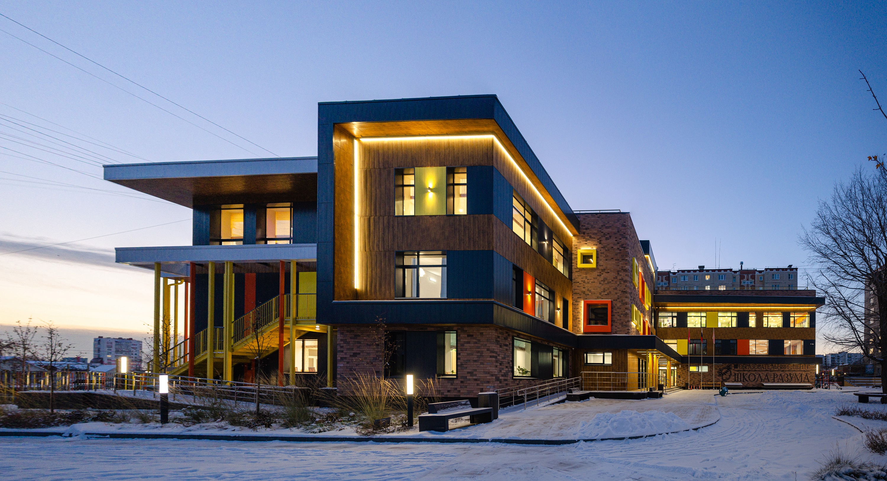 Архитектурный облик трансформируется от строгого у входа в более «игривый» у детсадовских групп. Для отделки использовали фасадные панели, кирпич и панорамное остекление. Территория благоустроена в едином ключе с архитектурой: спортивные и детские площадки, амфитеатр, учебно-опытная зона с теплицей. Проект архитектуры и ландшафта студии стал примером того, как реконструкция способна превратить утративший ценность объект в современную «школу мечты».