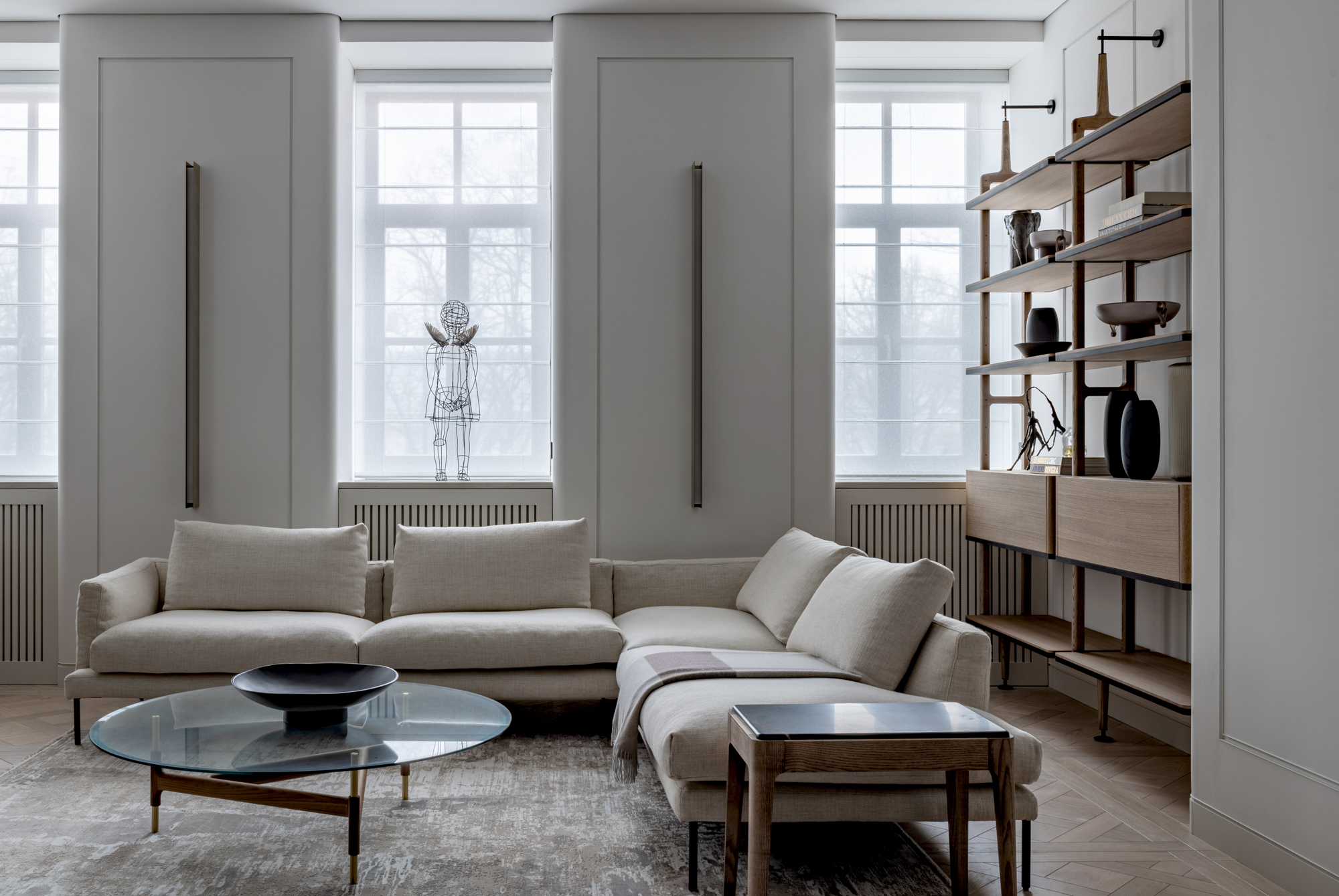 При создании интерьера одной из главных задач было сохранение пространства «чистым», наполненным светом и воздухом. Концепция проекта основана на приеме соединения классических мотивов с минималистским интерьером.