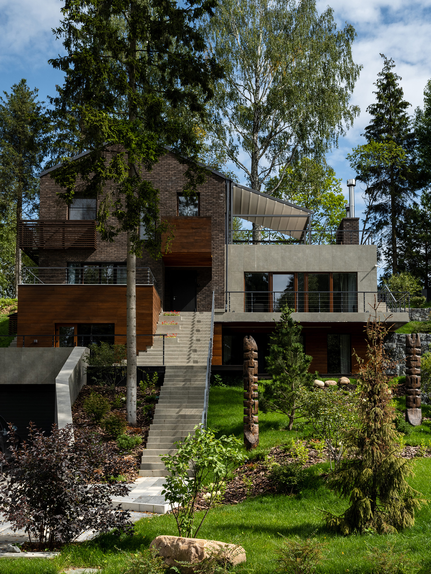 О проекте: Частный дом в закрытом коттеджном поселке в Подмосковье – проект, выдержанный в чертах минимализма c восточными нотами. Он разработан и реализован с учетом не только пожеланий заказчика, но и особенностей ландшафта. Дом расположен на участке с нестандартным рельефом – крутой склон лесистого оврага, перепад высот достигает 12 метров. Заказчик выбрал этот участок неслучайно: ландшафт напомнил ему каньоны и холмы любимого острова Бали. Изучив необычный рельеф, хозяин решил построить на этом участке многоярусный дом, разработку проекта дома доверив специалистам бюро ab2.0 – авторам генерального плана коттеджного поселка и его архитектурного облика.