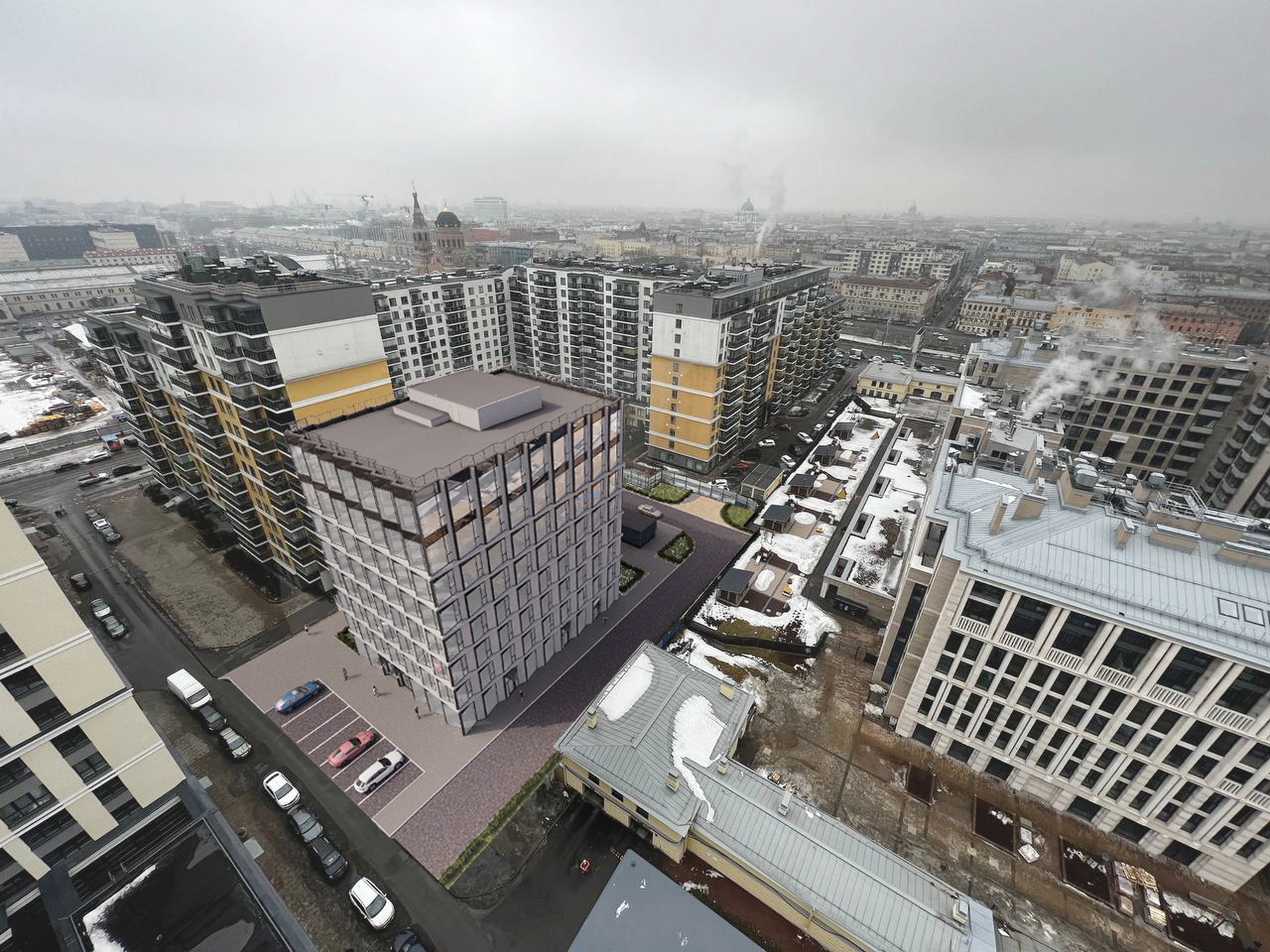 Основной объем имеет прямоугольную в плане форму. Масштаб, ритм и уникальность образа создаются зубчатыми элементами, рассеченными поясами. Этот объем соединен с брандмауэром соседнего здания через 6-этажный элемент с плоским фасадом. Таким образом 8-этажная часть становится акцентной, несмотря на меньшую высоту и общий объем. Фасад представляет из себя витражную конструкцию со светопрозрачным и глухим заполнением в светлых тонах.
