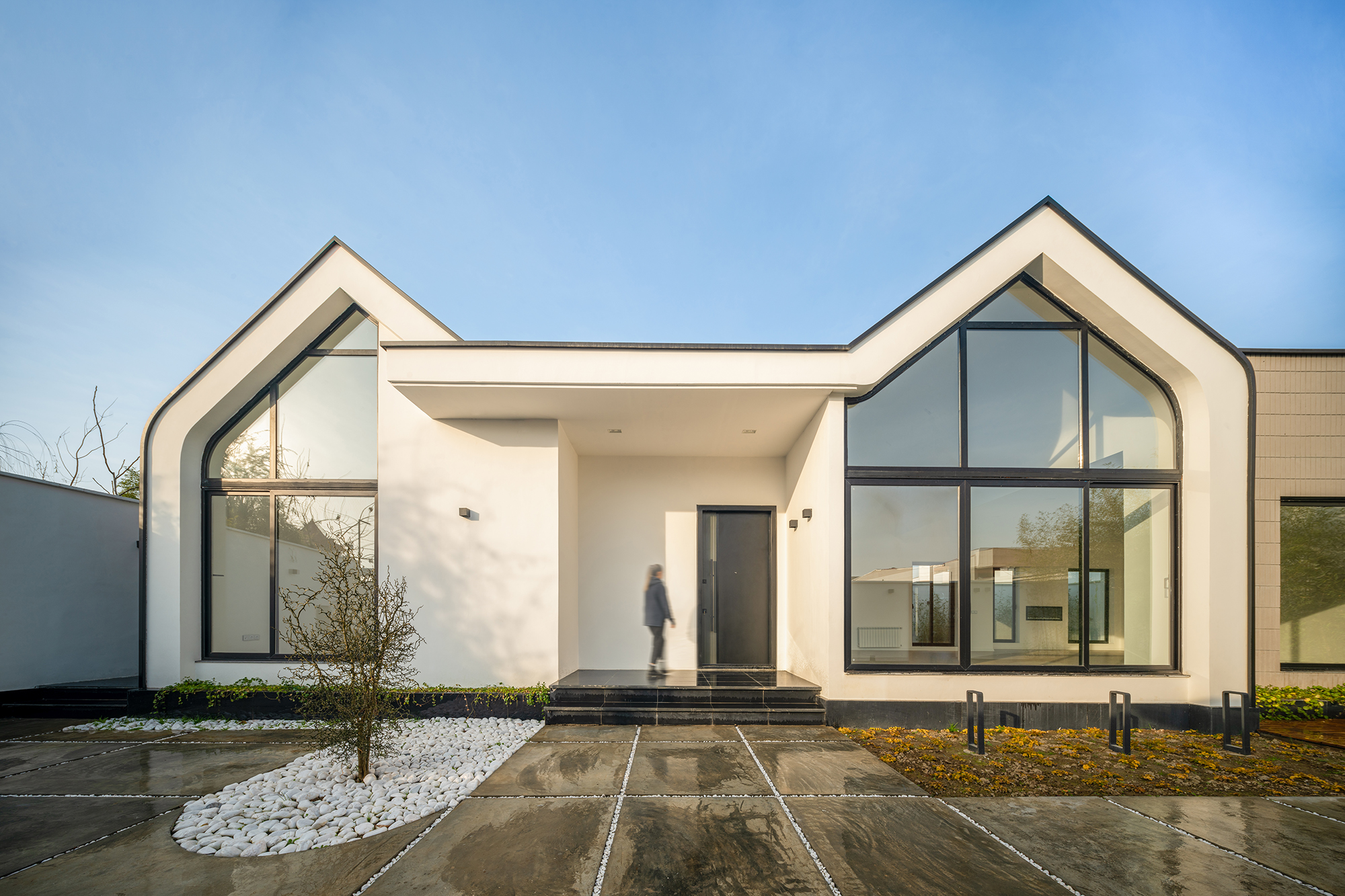Этот частный дом был построен в 2022 г. на участке площадью 412 кв. м. Дом состоит из четырех объемов с чередующимися остроконечными и плоскими участками кровли. Благодаря такой смеси традиционного и современного зодчества, а также удачному выбору материалов, вилла практически не выделяется на фоне современной застройки. После размещения дома места на участке осталось не так уж много, но авторам все же удалось разместить на нем бассейн, о котором так мечтал заказчик.