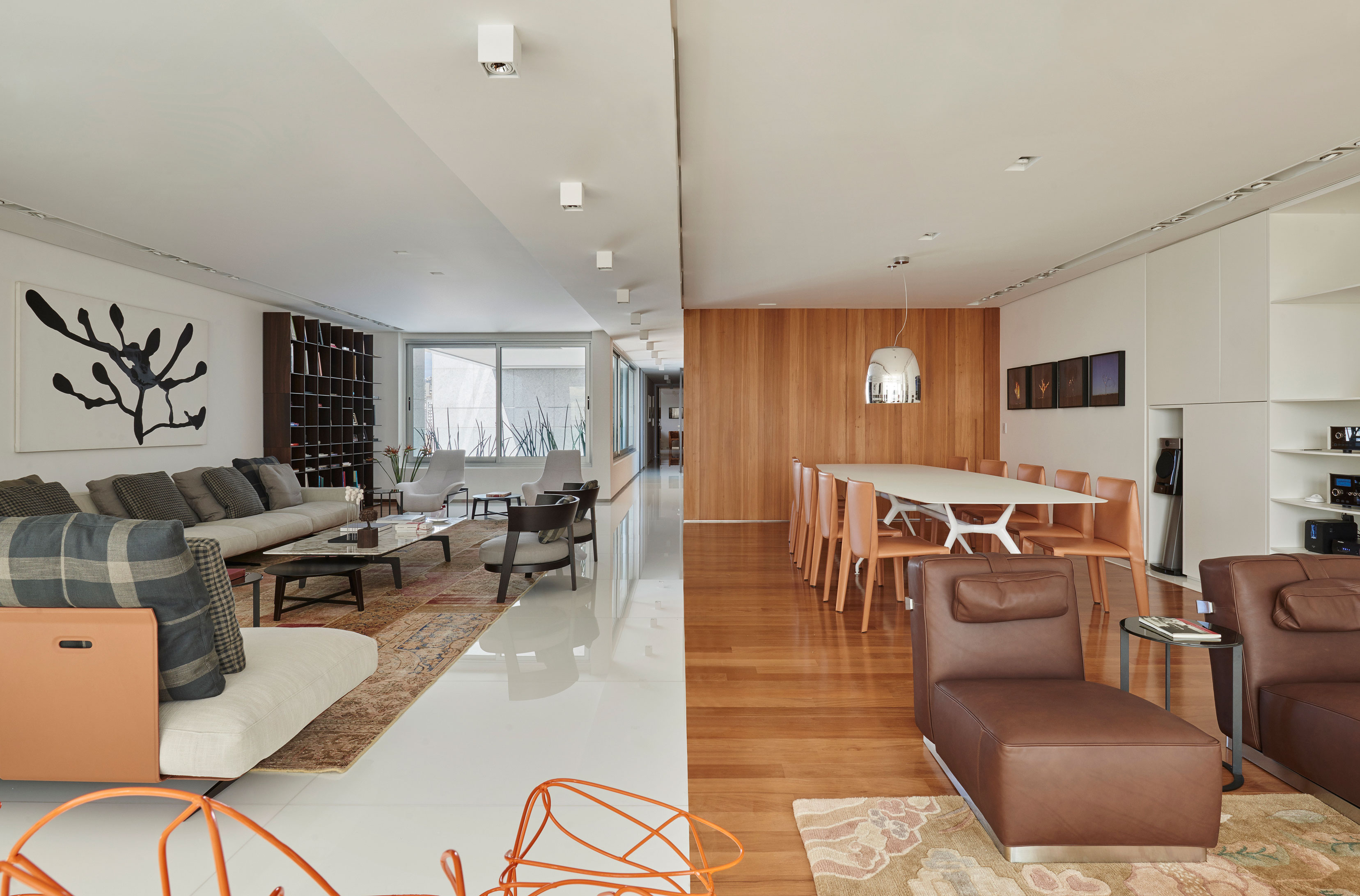 О проекте: Разработка проекта началась еще до завершения строительства дома. Квартира площадью 360 м² находится в городе Белу-Оризонти (столице штата Минас-Жерайс, Бразилия). Все пространство – три жилые комнаты и кабинет – делится пополам по оси коридора за счет использования двух разных материалов в качестве напольного покрытия. Сочетание традиционного теплого дерева и современного белого наностекла сообщает интерьеру особую элегантность и стиль.