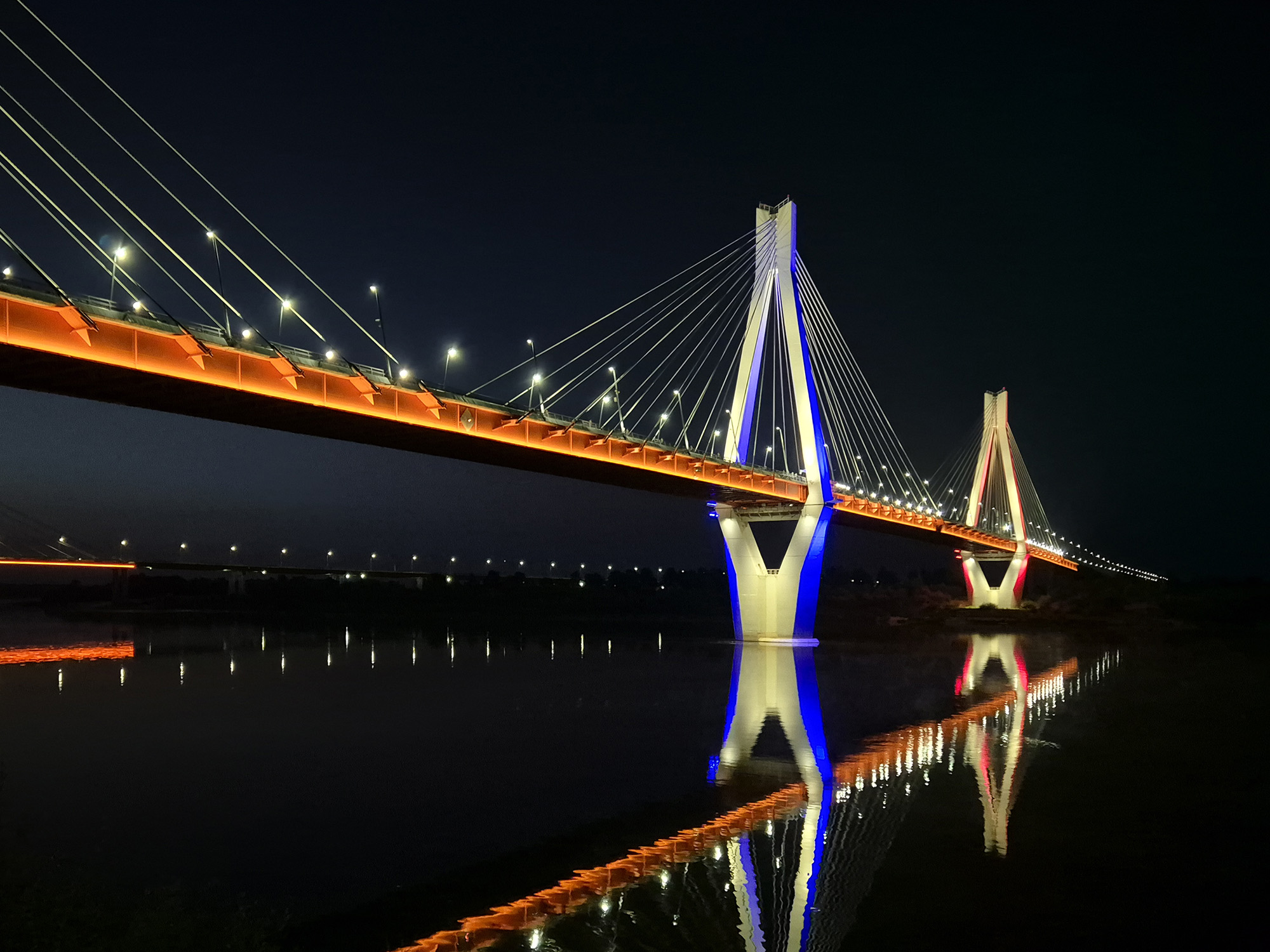 Освещенные холодно белым светом ванты связывают пилоны между собой и формируют вечерний силуэт моста.