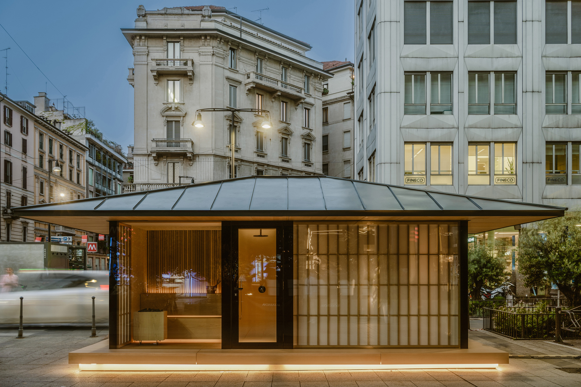 О проекте: Проект спа-салона в японском стиле в историческом квартале Брера в центре Милана - плавучая платформа 4,5 х 9 м, на которой установлен модульный домик (2,5 х 6 м) с раздвижными дверями сёдзи.