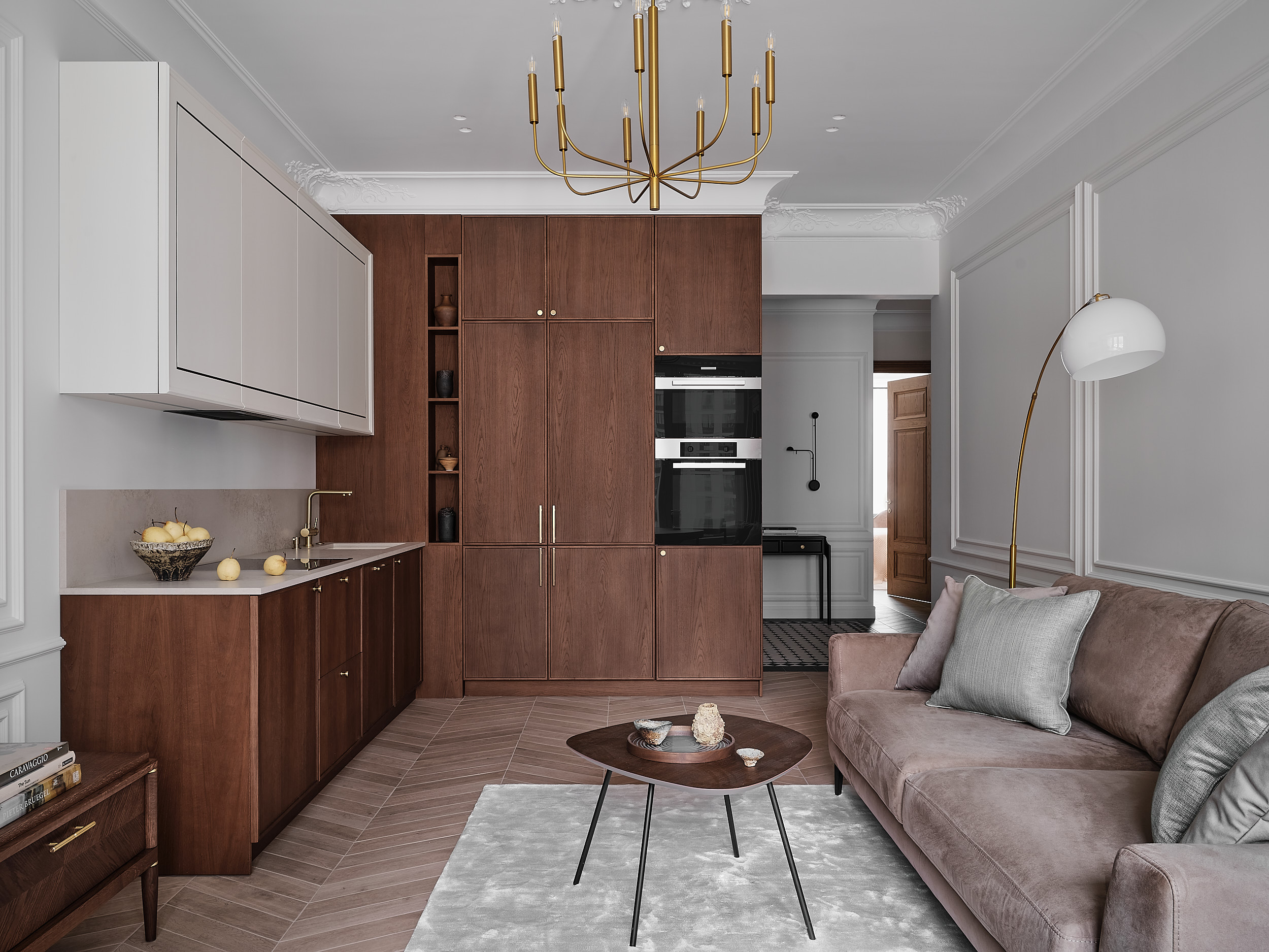 Описание проекта, предоставленное заявителем: Этот проект разрабатывался для большой семьи из 5 человек. Было очень важно разработать дизайн для каждого из членов семьи, при этом сохраняя общую стилистику всего интерьера. Поэтому за основу я взяла классические мотивы интерьеров, внедряя в квартиру современные предметы. Например, в прихожей я использовала традиционные отделочные материалы, такие как метлахская плитка, молдинги, лепнина, но, добавив сюда современный свет, интерьер заиграл абсолютно другими красками. В квартире присутствует много дерева, это придает теплоты этому элегантному интерьеру. Работа над реализацией этого проекта приносила мне большое удовольствие, потому что заказчики являются обладателями хорошего вкуса, и во многих решениях мы сходились практически с первого раза.