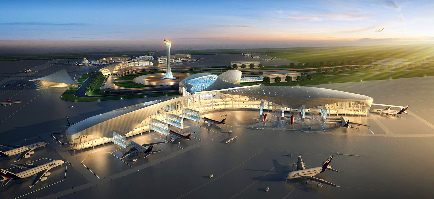Плавные очертания здания напоминают воздушный винт, который и послужил источником вдохновения. Простота и в то же время – современность форм нашли отражение и во внутренней планировке терминалов. Аэропорт станет крупным транспортным узлом, обслуживающим как внутренние, так и международные рейсы.