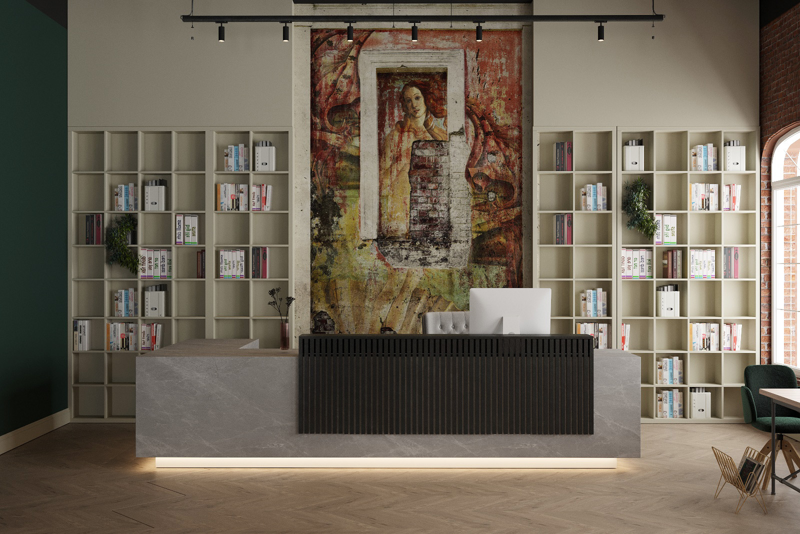 Библиотека расположена в школе искусств. Авторы решили взять классическую архитектуру в качестве основы, но подвергнуть ее современной обработке. Чтобы привлечь внимание к главной стойке библиотекаря, использовали обои с изображением картины "Рождение Венеры". Для подчеркивания оранжевого цвета картины добавили контрастный зеленый на некоторые стены, шумопоглощающие панели и другие элементы интерьера.