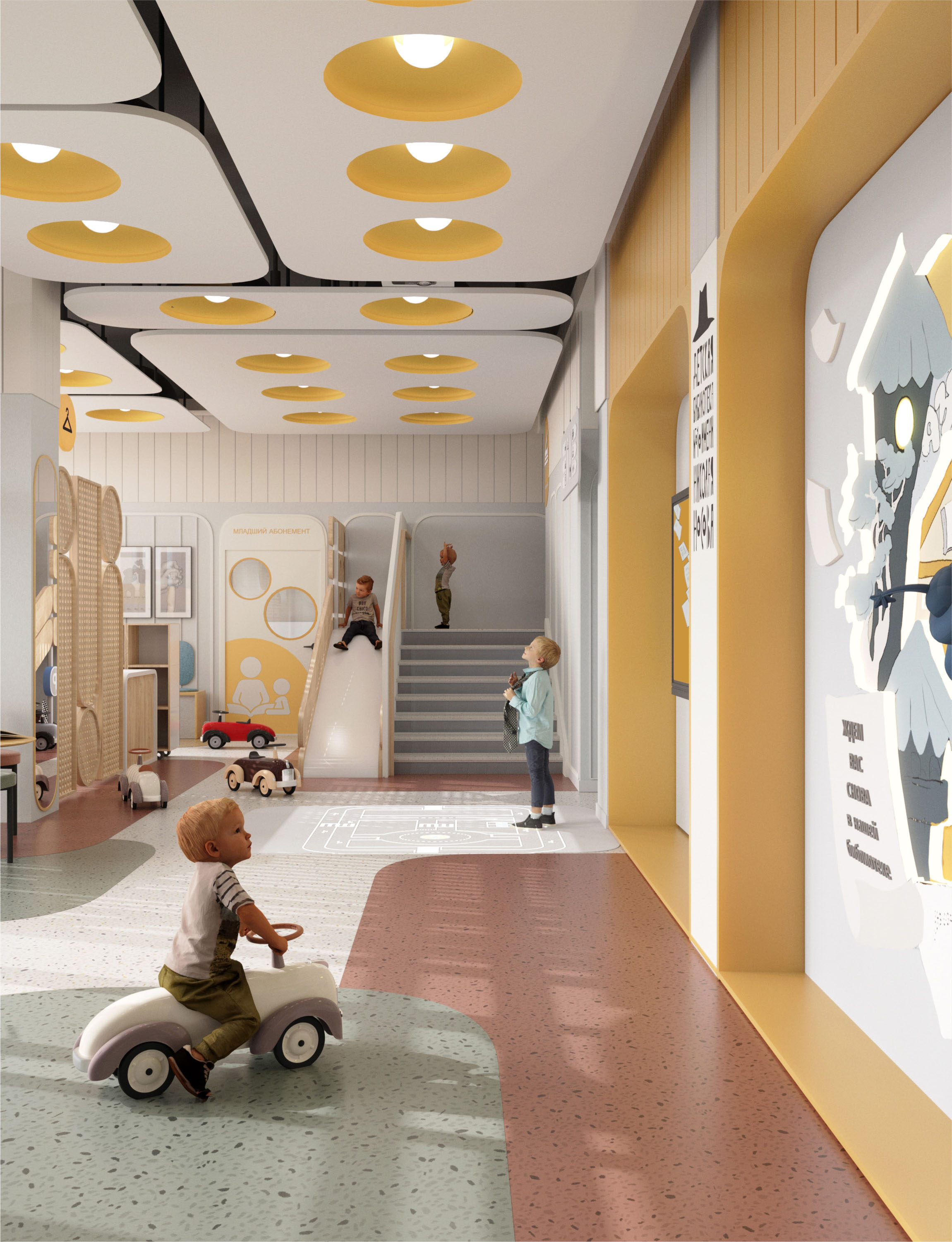 Цель проекта – создание функционального и комфортного интерьера для семейной аудитории, насыщенного отсылками к творчеству детского писателя Н. Носова, чье имя носит библиотека. Проектом предусмотрены игровые зоны для детей: здесь появятся макет Цветочного города, машинки Шпунтика и Винтика, знаменитая Шляпа и другие узнаваемые детали из произведений Н. Носова. Для взрослых читателей запланированы уютные зоны для чтения и уединенной работы.