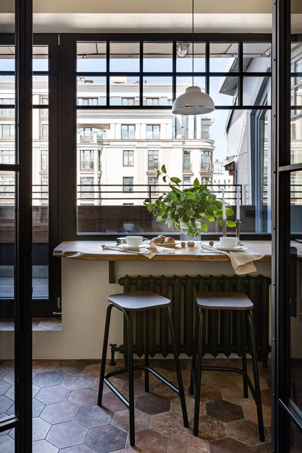 Данный проект представляет собой реконструкцию двухэтажной мансарды. Красное кирпичное здание на Виленском переулке, в котором располагается квартира, изначально принадлежало казармам Саперного батальона. Красный кирпич, металлические балки навевали лофт-стилистику, так как интерьер должен быть созвучен экстерьеру. Был выбран уютный микс из лофта, бохо и скандинавских мотивов. На первом этаже расположились два санузла и кухня с кладовой, лежащая на единой оси с просторной гостиной. Из гостиной двери ведут в кабинет и спальню хозяев. И спальня, и кухня, и гостиная, и кабинет имеют выходы на террасы. Дымоход действующей чугунной печи вторит открытым металлическим балкам мансарды.