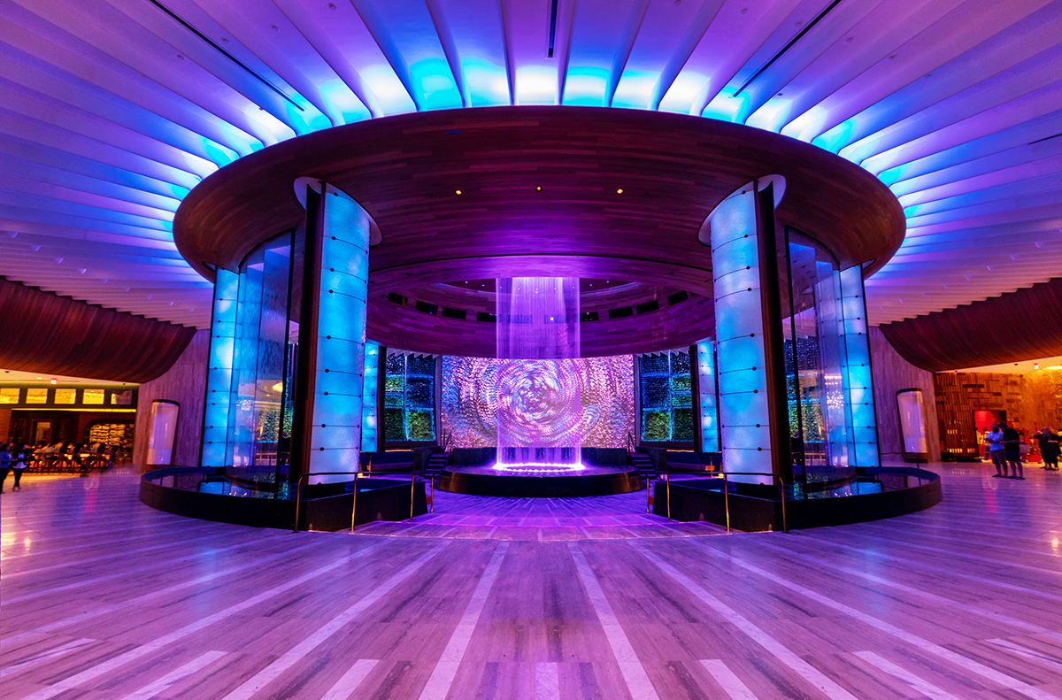 Опроекте: Объект размещен на входе в новое здание казино при отеле Hard Rock в г. Семинол (ш. Флорида). Ротонда из тикового дерева, стоящая на мраморном полу, идеально сочетается с остеклением и зеленой плиткой на стенах, представляя из себя нечто среднее между традиционным фонтаном и предметом цифрового искусства. В отличии от обычных вестибюлей здесь с помощью дизайна пространство преобразовано в настоящее театрализованное представление. Используя богатое культурное наследие бренда Hard Rock, средства трехмерного моделирования, пластику воды и игру света авторы создали точку притяжения для всех посетителей этого места.