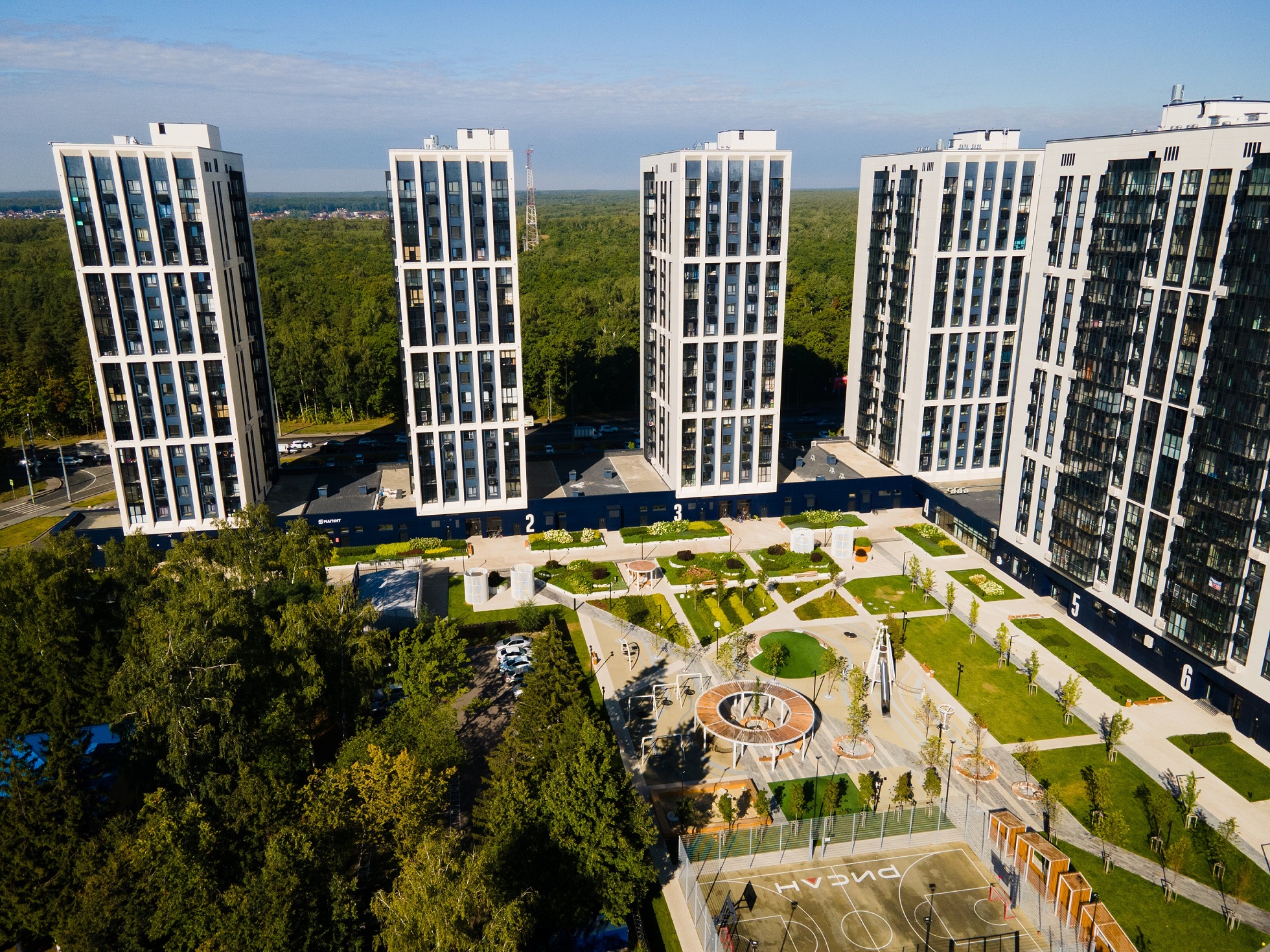 Отличительными особенностями проекта стали строгая архитектура и новая система безопасности - в комплексе установлено свыше 300 камер видеонаблюдения, виртуальный консьерж для помощи жителям, а вход на территорию осуществляется по ключам с разным уровнем доступа.