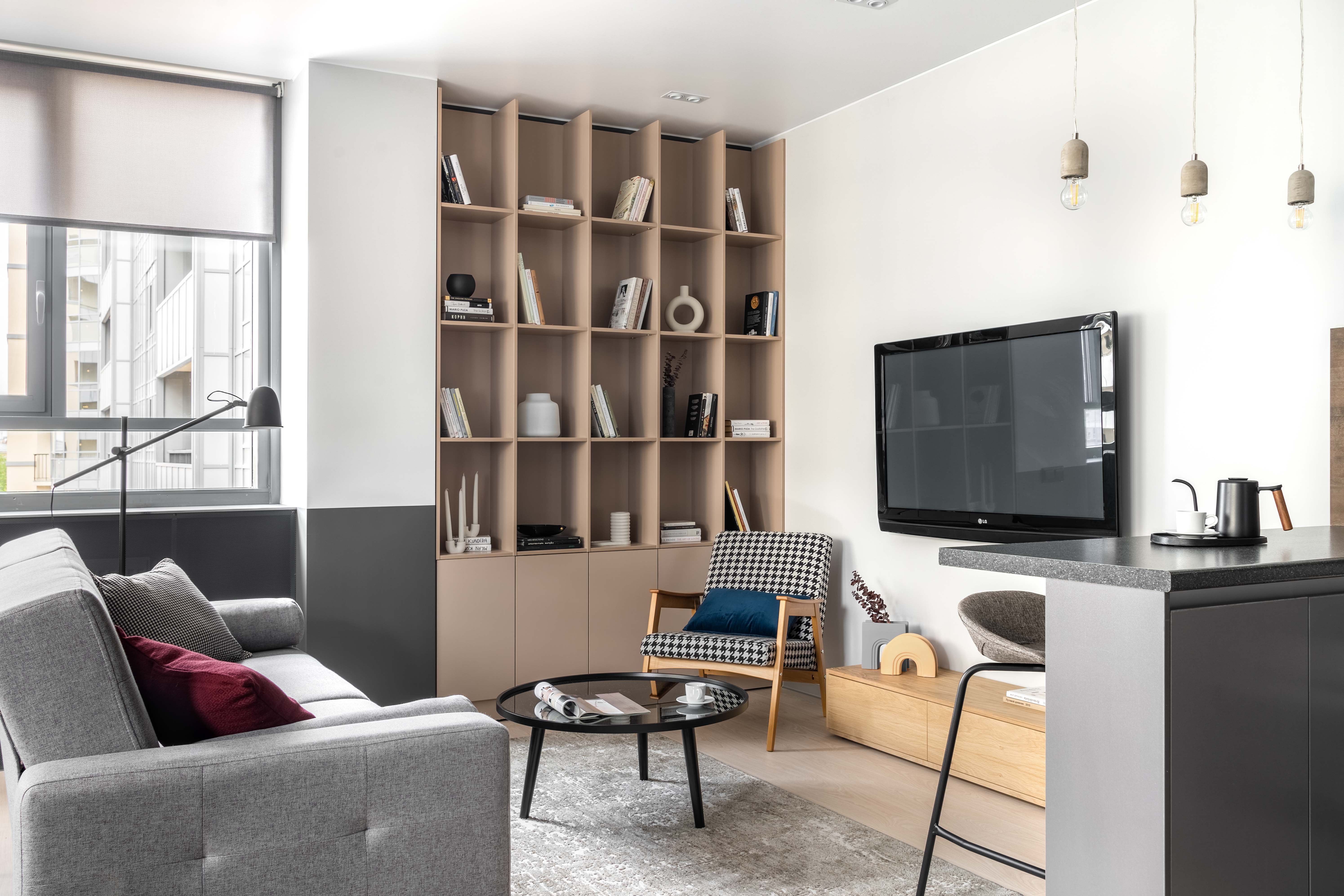 Зона спальни, прихожей и санузла выполнена в темно-серой гамме – такое решение позволило визуально объединить эти помещения в один утилитарный блок, который эффектно подчеркивает светлую палитру кухни-гостиной. Сдержанную серую гамму было решено сбалансировать дерзким сочетанием бордового цвета в оттенке бургунди с принтом «гусиная лапка». Стену в зоне столовой украшает абстрактный постер с изображением женщины.