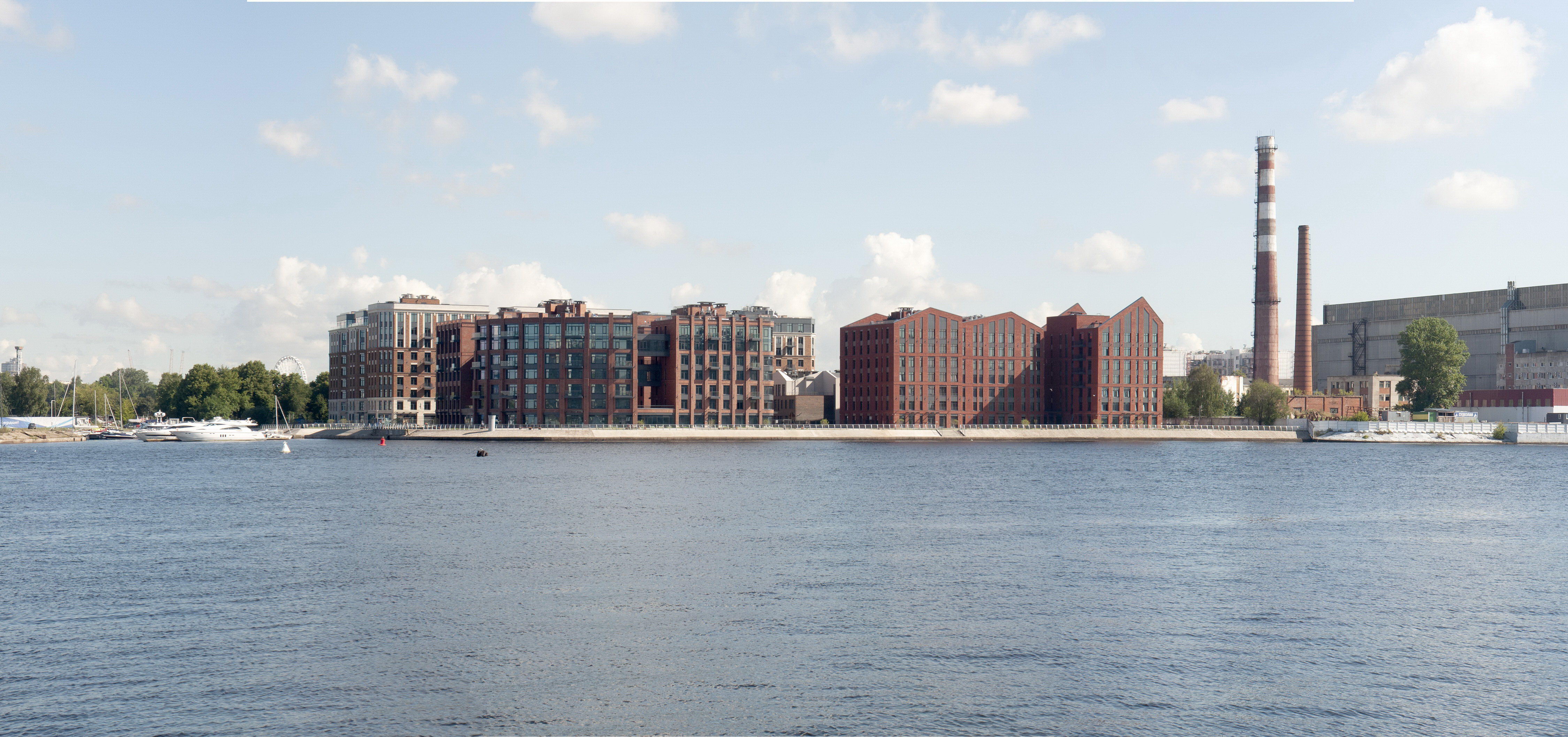 Корпус А формирует красную линию ул. Петровская Коса и развивает идеи исторической застройки Петроградской стороны конца XIX-начала ХХ веков. Корпус Б, расположенный на мысу, - основной элемент панорамы острова. Тектоника фасада учитывает его восприятие с дальних точек. Мощные контрфорсы задают ритм, отсылая к мотивам промышленной кирпичной архитектуры XVIII-XIX веков. Корпус В состоит из трех объемов, объединенных в уровне первого этажа. Фронтоны придают зданию силуэтность, характерную для жилой застройки Голландии.