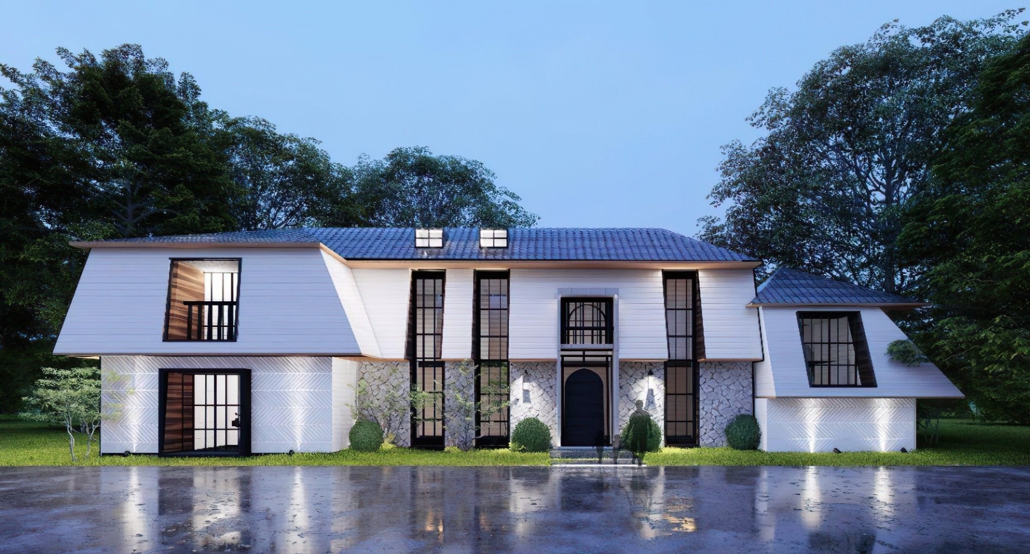 В ходе реконструкции фасад был полностью переосмыслен: он стал пропускать больше естественного света, отражать величественный характер интерьеров дома и создавать легкое ощущение сказочности при входе. Для визуального удлинения фасада были добавлены большие окна, слуховые окна и изящное окно-жюльетта в честь исторического облика и возраста здания.