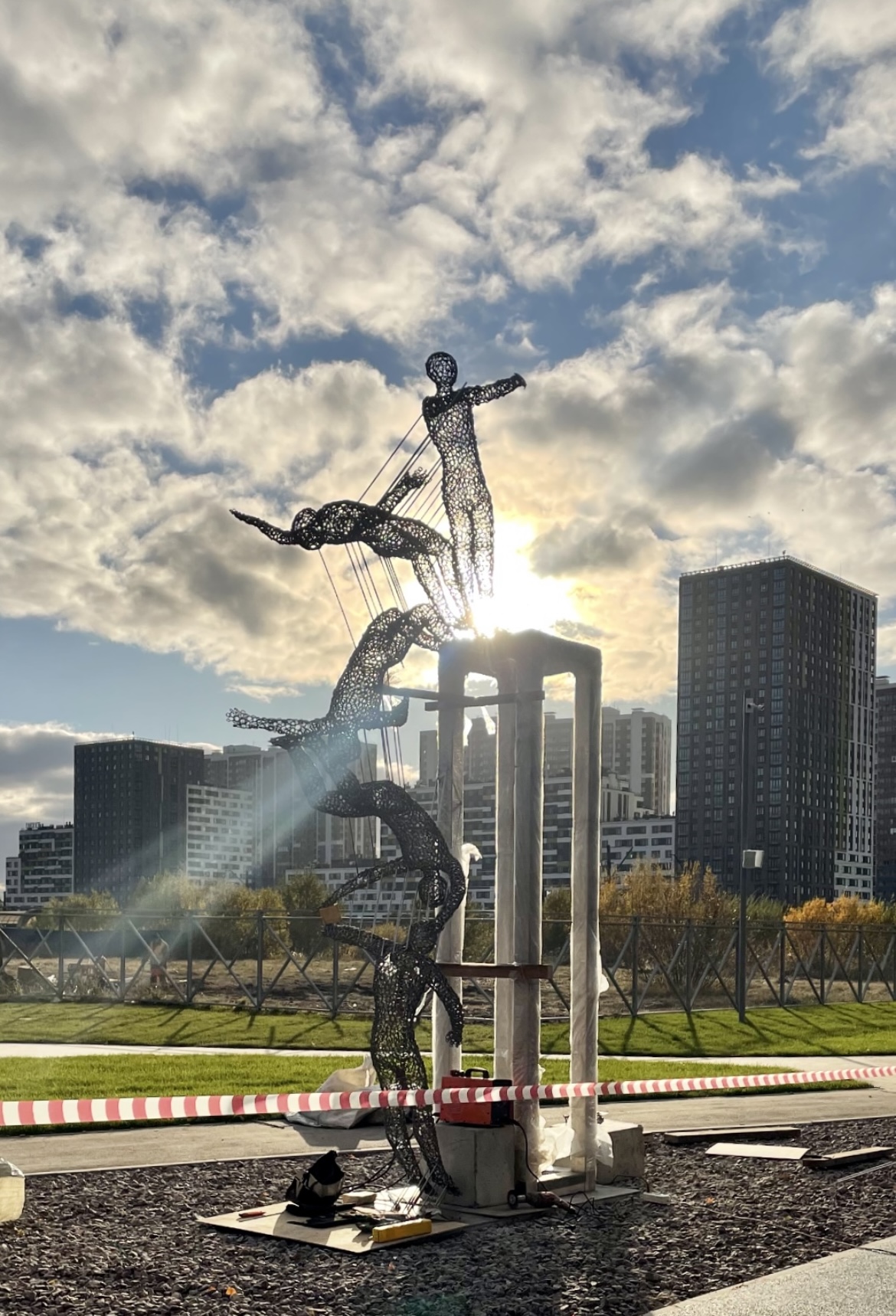Описание проекта, предоставленное заявителем: Объект Антонины Фатхуллиной «Свободное падение» - монументальная четырехметровая скульптура, установленная на паркур-площадке около Дунайского путепровода. Художник, оставаясь верной своей технике работы с материалом, находит тонкое воплощение парадокса падения: она превращает онтологически тяжелый и цельный металл в парящую атомизированную материю, пронизываемую светом и воздухом. 18000 вручную сваренных нержавеющих стальных колец создают хрупкое кружево человеческих фигур. А тонкие металлические соединения обнажают вязкую категорию пространства-времени. Вслед за кубистами Антонина фиксирует динамичность формы, единовременно изображая континуум движения в множестве моментов. Так, феномен падения делится на пять стадий полета, преодолевающих закон гравитации: от парения в невесомости, через петлю до удачного приземления.