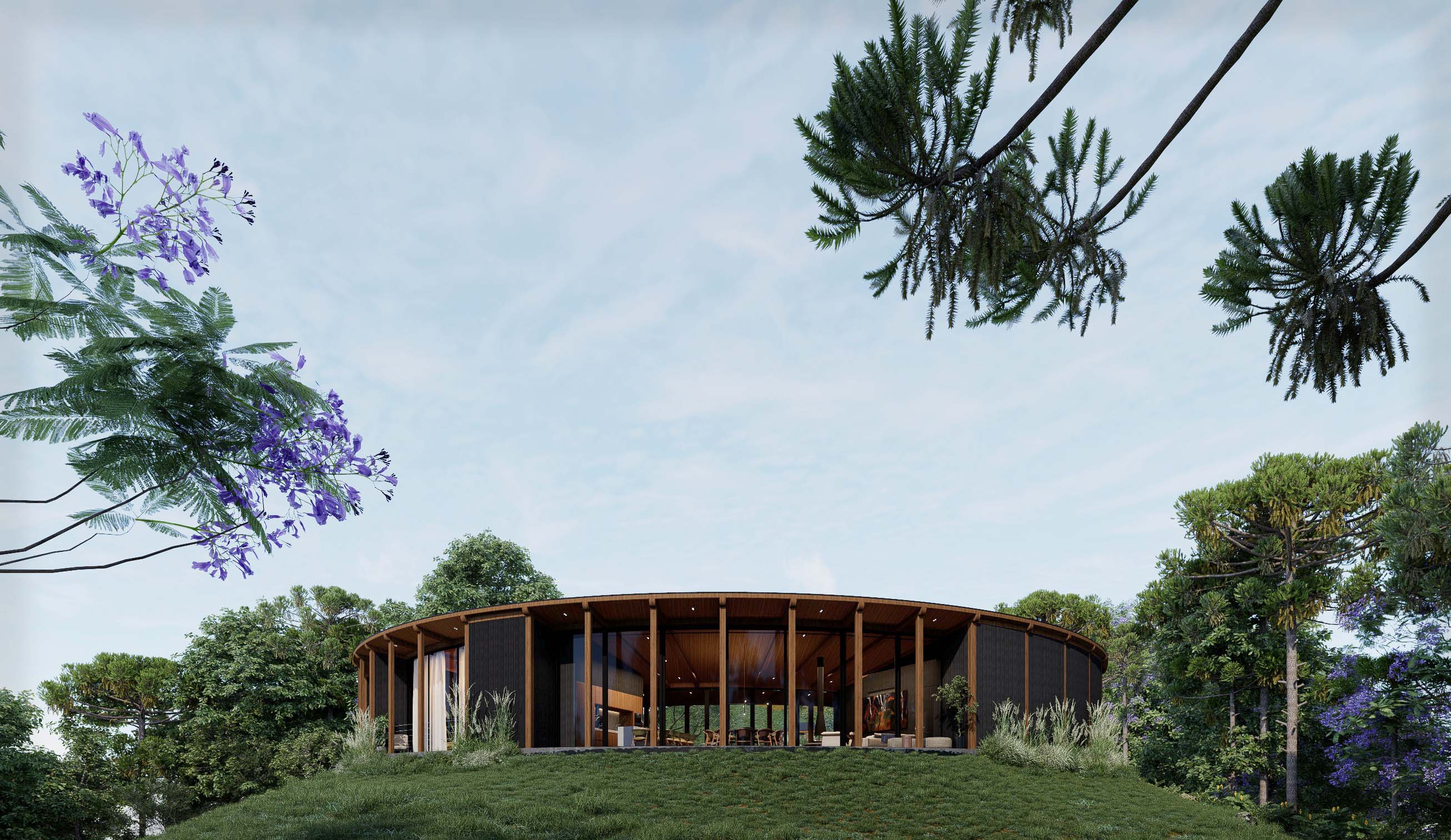 Set below street level, the house is designed to preserve the surrounding views and landscape, respecting the region's authenticity and natural beauty. It is divided into two blocks: a social block facing the mountains and an intimate block facing the native Atlantic Forest. The semi-circular shape of the house follows the natural terrain, ensuring smooth integration and optimizing thermal efficiency.